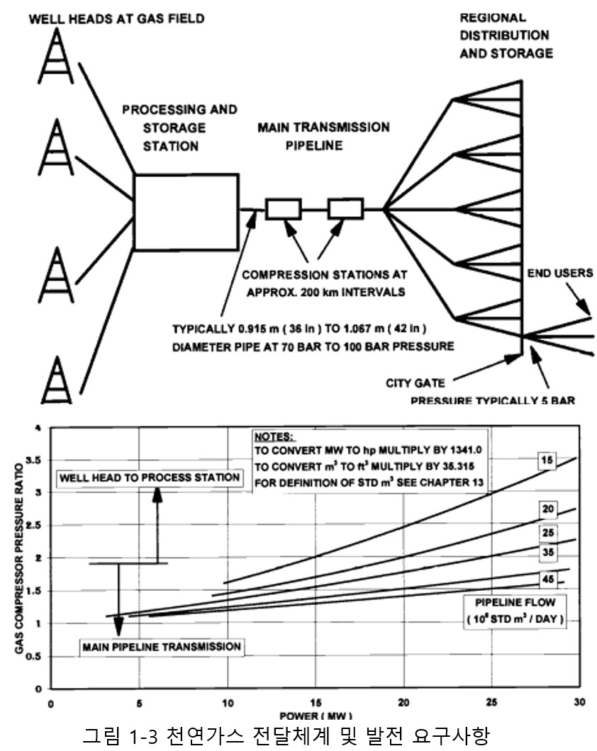 그림 1.3은 천연가스 파이프라인 시스템의 구성을 보여줍니다. 여기서 가스는 유정에서 산업 및 가정용 소비자에게 송출됩니다. 파이프라인의 직경은 일반적으로 915mm(36인치) ~ 1420mm(56인치)이며 일반적으로 지하에 있습니다. 주목할 만한 예외 사례는 영구 동토층이 녹는 것을 방지하면서 올려야 하는 영구 동토층 지역입니다. 이러한 시스템은 약 200km마다 압축설비(Compression Station)를 포함하여 수천 킬로미터에 걸쳐 확장될 수 있습니다. 예를 들어 파이프라인은 캐나다 앨버타주에서 미국 동부 해안까지 이어집니다. 발전소는 파이프라인에서 추출한 천연가스를 태우고 원심 압축기를 구동합니다. 그림 1.3은 또한 천연가스의 일반적인 유량 대비 펌핑 동력 및 파이프라인 압축기 압력비를 보여줍니다. 비교를 위해 겨울철에는 4인 가족이 하루에 최대 10 표준 세제곱미터를 소비할 수 있습니다. 가스 터빈의 또 다른 용도는 고갈된 천연가스전으로 물을 펌핑하여 가스 추출을 증가시키는 것입니다. 이에 비해 송유관은 덜 복잡합니다. 오일은 정유정에서 정유 공장으로 송출되고 때때로 증류 연료가 대규모 산업 사용자에게 송출됩니다. 유정에서 오일을 추출하는 작업에는 가스를 아래로 펌핑하여 압력을 높이고 가스를 버블링하여 추출 파이프 위로 오일을 밀어 올리는 작업이 포함될 수 있습니다.