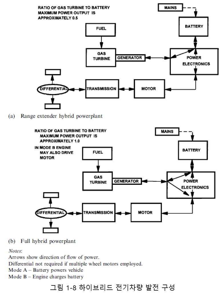 엄격한 무배출 법안이 캘리포니아와 같은 세계의 특정 지역에서 중요한 틈새시장을 창출하고 있습니다. 완전한 전기 자동차는 나트륨 유황과 같은 가장 진보된 배터리 시스템을 사용하지만, 배터리를 재충전하기 전에 성능과 범위가 제한적이게 됩니다. 이와 같은 특성을 극복하기 위해, 열 엔진은 현재 개발 프로그램 및 연구 대상인 두 가지 중 가능한 한가지 하이브리드 구성을 장착할 수도 있습니다. 그림 1.8은 두 가지 하이브리드 전기 자동차 구성에서 작동할 수 있는 다양한 모드를 설명합니다.