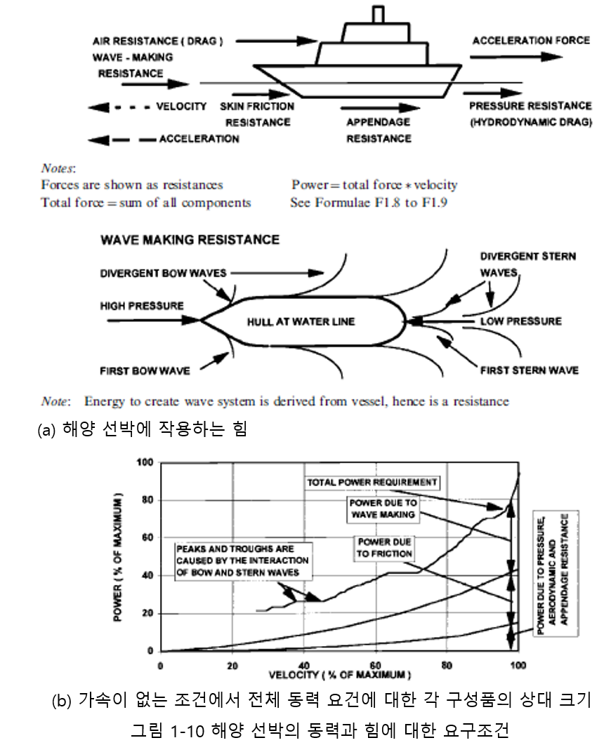 그림 1.10은 선박의 전진 운동에 필요한 총 동력을 구성하는 요소를 보여주고 정량화한 내용입니다. 잔잔한 물을 항해하는 선박은 두 가지 파형을 생성합니다. 하나는 뱃머리에 높은 수압이 있고 다른 하나는 선미에 감소한 수압입니다. 이 파동 시스템을 생성하는 에너지는 조파 저항을 통해 선박에서 파생됩니다. 고속에서는 파동 저항이 지배적입니다. 실제로 주어진 선체 설계의 경우, 조파 저항을 위한 임계 선체 속도에 도달합니다. 여기서 선박은 말 그대로 물 언덕을 오르고 추진 추력은 위쪽으로 기울어지며, 이 속도를 초과하는 것은 비경제적입니다. 조파 저항 곡선에 중첩된 사인파 효과는 선수 및 선미파 시스템의 상호 작용으로 인한 것입니다. 표면 마찰 저항 또는 마찰 형태의 저항도 전체 저항의 주요 원인입니다. 이러한 마찰은 선체와 물 사이의 마찰을 의미합니다. 압력 저항, 유체 역학적 항력 또는 형상 항력은 선체 주변의 물의 흐름 분리로 인해 불리한 역압력장을 생성합니다. 그에 대한 결과로 발생하는 소용돌이 또는 와류는 저항을 만드는 파장에 의해 생성된 파장에 더해지게 됩니다. 흘수선(Water line) 위의 선박 항력으로 인해 발생하는 공기 저항은 총저항의 5% 미만입니다. 종종 저속 선박의 경우 공기역학적 형상에 거의 노력을 기울이지 않습니다. 위의 네 가지 저항은 Naked Resistance를 구성합니다. 전체 저항을 평가하려면 부속물 저항을 추가해야 합니다. 이는 러더, 돌출 종통재(bilge keels), 프로펠러 등에 의해 발생하는 손실에 해당하며, 전체 저항의 10% 미만입니다. 전통적으로 선체 설계에 대한 이러한 저항은 물탱크에서 모델 테스트를 한 다음, 무차원 그룹을 사용하여 결과 공식 및 계수를 실제 선체 크기로 확장하여 평가합니다. 이러한 과정은 복잡합니다. 동력 요구 사항은 단순 부력으로 무게를 지탱하는 변위 선체에 대한 선체 속도 대한 세제곱 법칙으로 근사할 수 있습니다. 이와 관련하여 저항이 용기 변위(예: 중량)에도 의존함을 확인할 수 있습니다. 동력은 유체역학적으로 양력을 생성하는 반평패 선체(semi planning hulls)에 대한 제곱 법칙으로 구할 수 있습니다.