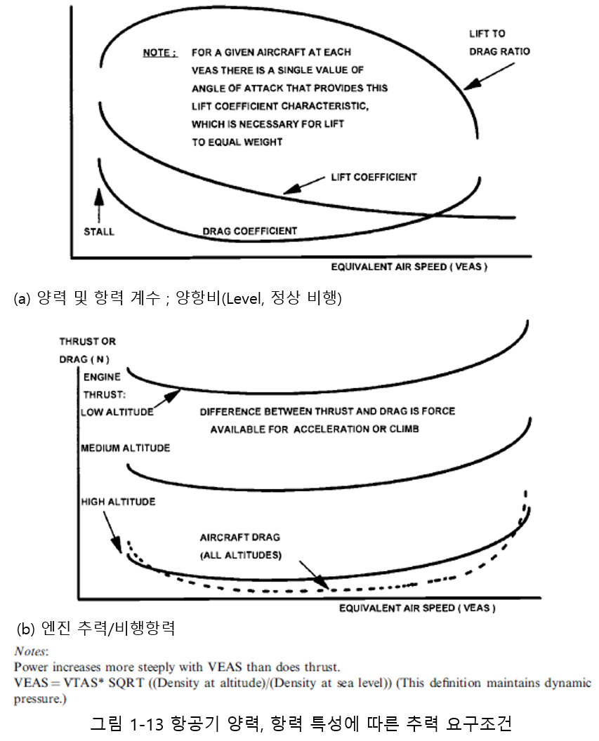 이러한 두 가지 항력 요소의 상호 작용은 그림 1.13에 표시된 등가 대기 속도에 대한 항력 계수의 특징적인 형상을 보여줍니다. 이와 관련하여, 주어진 등가 대기 속도에 필요한 순 추력이 양력 대 항력 비율에 반비례한다는 것을 공식으로 보여줄 수 있게 됩니다. 등가 대기 속도와의 관계 형태는 그림 1.13에도 나와 있으며 양력 계수와 항력 계수의 비율(양항비)에 따라 결정됩니다. 순항 중인 아음속 수송기의 양력 대 항력비(양항비)는 20에 근접할 수 있지만, 초음속 수송기의 경우 10 미만입니다. 낮은 고도에서 전투 중인 전투기의 경우, 그 값이 낮은 고도에서 전투 중인 전투기의 경우 5 미만으로 떨어지고, 고성능 글라이더의 경우 55까지 올라갈 수 있습니다.