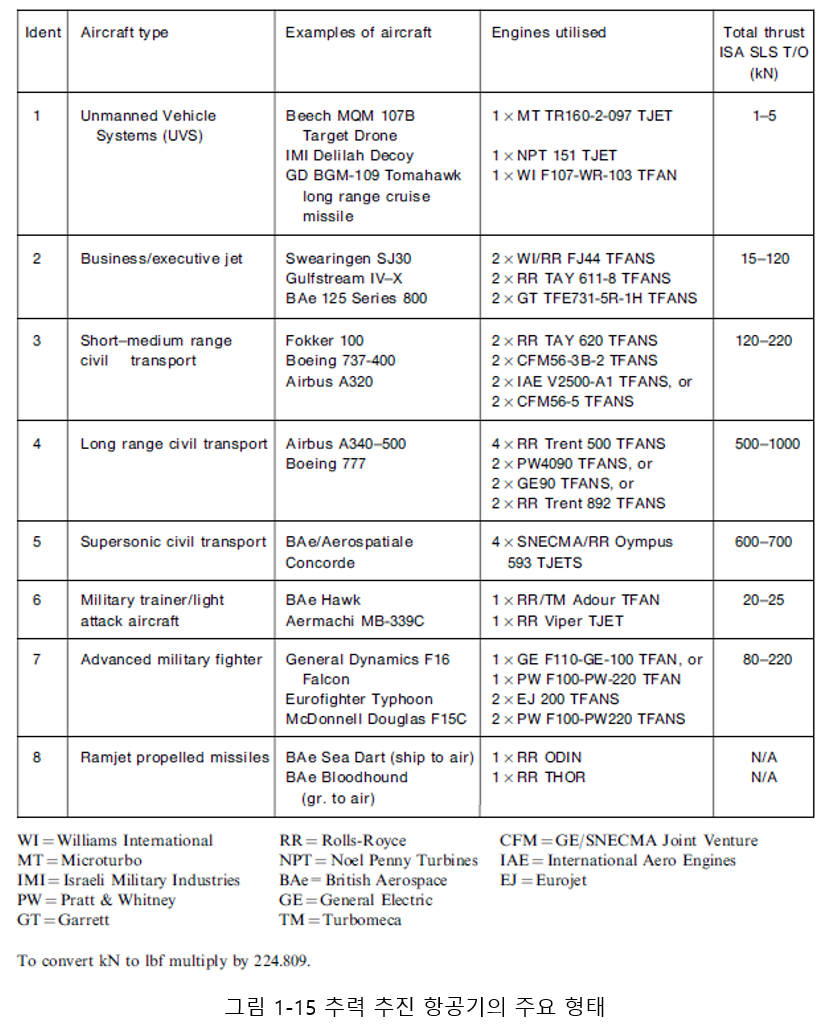 그림 1.15는 실제 항공기 및 적용된 엔진의 사례와 함께 추력 추진 항공기의 주요 등급을 나타냅니다. 차트 1.10은 그림 1.15의 식별 정보를 사용하여 이러한 항공기 등급의 특성을 나타냅니다.