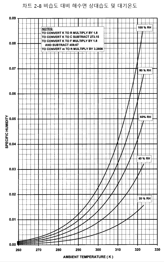 대부분의 가스 터빈 성능 목적에서 비습도는 섭씨 0℃도 이하, 섭씨 40℃ 이상에서는 무시할 수 있습니다. 후자의 경우, 최고 기온이 물이 부족한 사막 조건과 같은 환경에서만 발생하기 때문입니다. MIL 210은 100% 상대 습도를 고려할 수 있는 최고 주변 온도로 35℃를 지시하고 있습니다.
