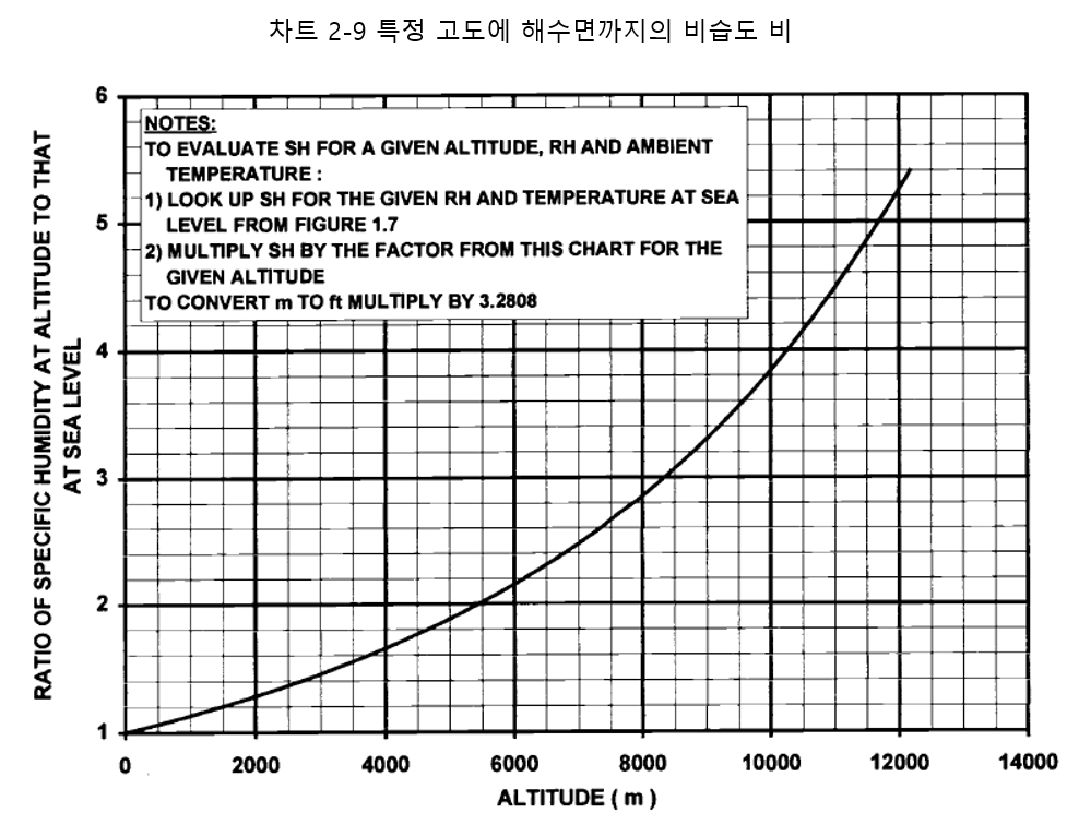 차트 2.8 및 2.9는 비습도 및 상대습도의 변환을 용이하게 합니다. 차트 2.8은 비습도 대비 주변 온도 및 해수면의 상대 습도를 나타냅니다. 다른 고도의 경우 차트 2.9는 차트 2.8에서 얻은 특정 습도에 적용할 요소를 나타냅니다. 주어진 상대 습도의 경우, 수증기압은 온도에만 의존하는 반면 기압은 상당히 낮기 때문에 비습도는 일정 고도에서 더 높습니다.
