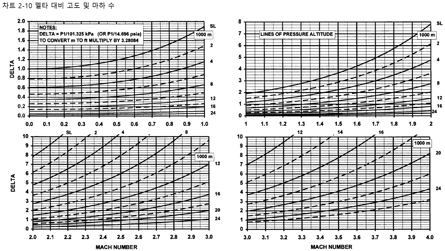 차트 2.10 그림 2.1 표시된 모든 비행 포락선을 포함하는 범위에서 기압 고도 마하수에 대해서 자유 흐름 조건에 기초한 델타를 나타냅니다. 입구 압력 손실이 엔진 성능에 미치는 영향은 추가적인 요소입니다. 차트 2.11 MIL 210 추운 , 표준 MIL 210 더운 날에 대해서, 유사한 범위에 걸쳐 기압 고도 마하수에 대한 자유 흐름 조건을 기반으로 세타를 나타냅니다.