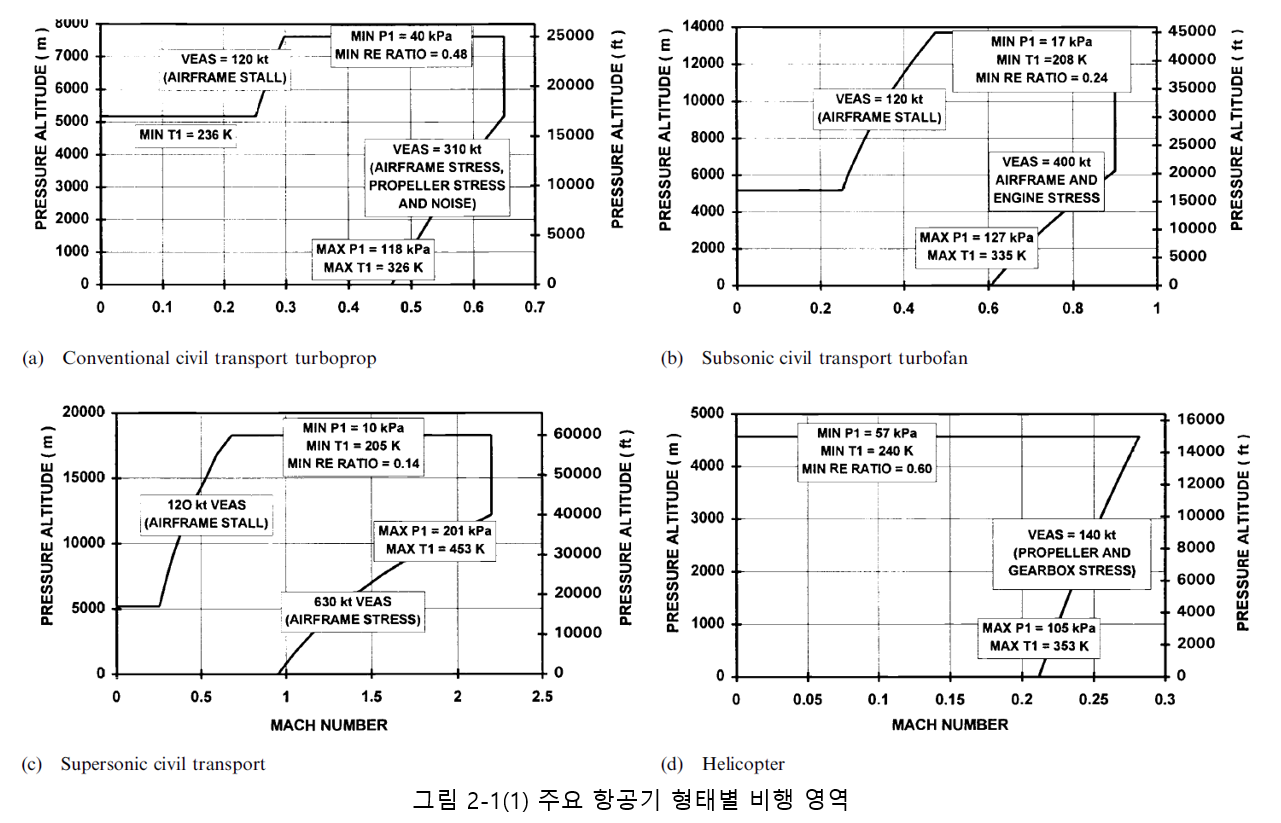 항공기 엔진은 환경 영역 외에도 다양한 전진 속도에서도 작동해야 합니다. 주어진 고도에 대한 비행 마하수의 범위는 비행 포락선에 의해 정의됩니다. 그림 2.1은 7가지 주요 항공기 유형에 대한 일반적인 비행 범위를 나타냅니다.