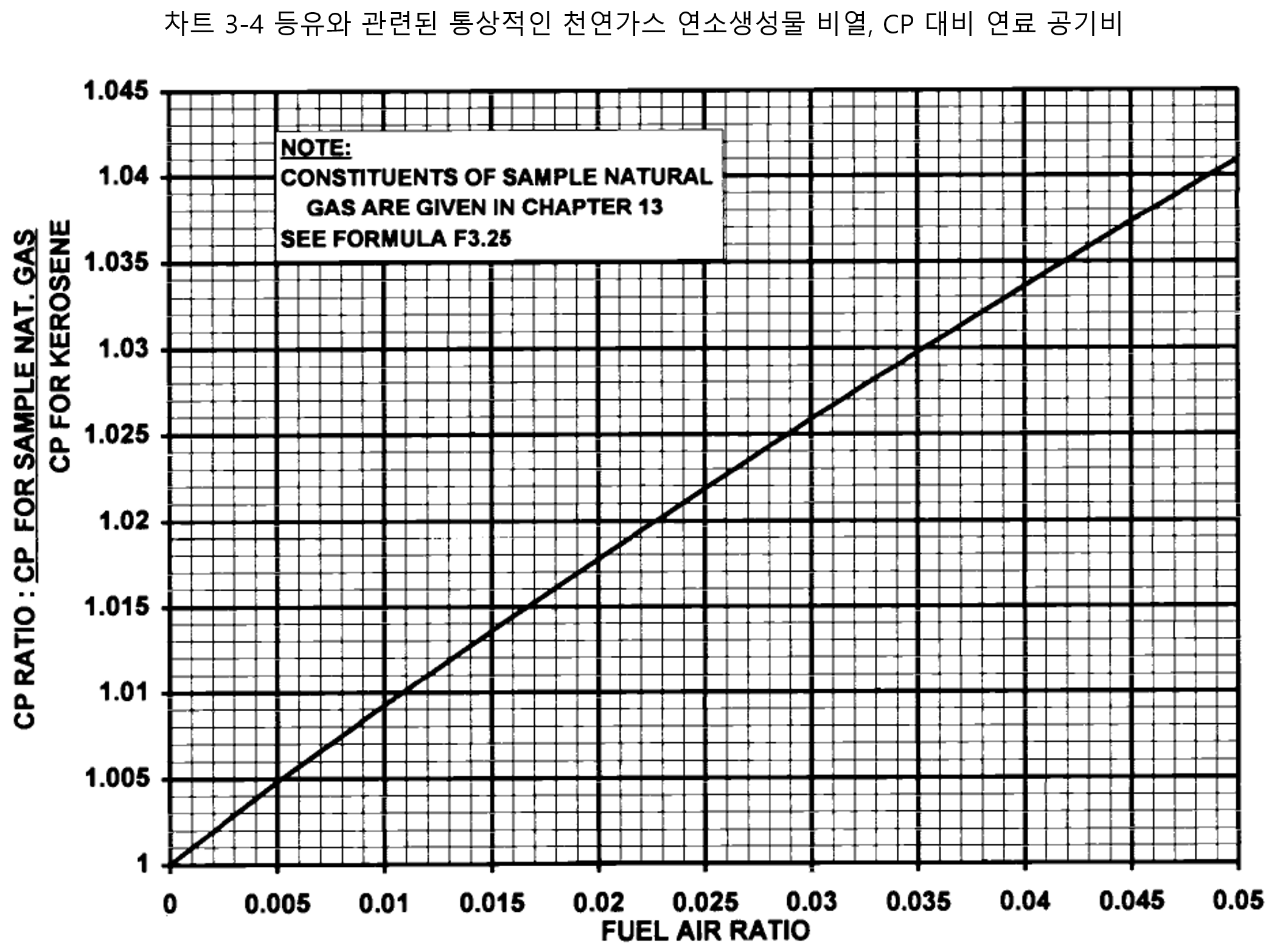 차트 3.1은 표시된 공기 대 연공비에서 선행 연료 유형의 연소로 인한 기체 상수를 보여줍니다. 다양한 혼합이 발생하기 때문에 천연가스에 대한 모든 관련 데이터를 제공할 수는 없습니다. 관련 내용을 분명히 하고자 아래와 같이 설명하고 있습니다: