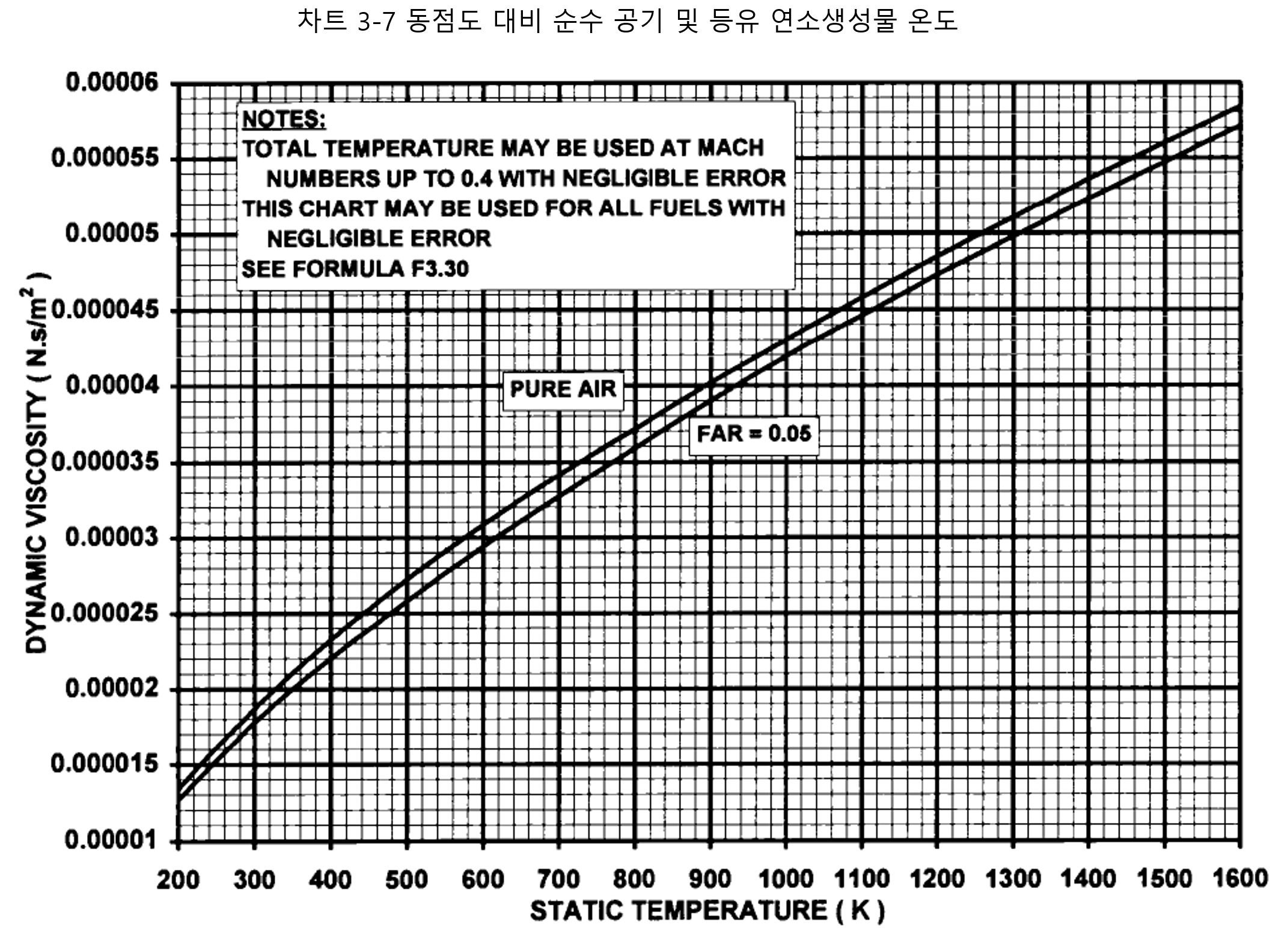 차트 3.7은 정 온도 대비 건공기 및 연소 생성물의 동점도를 보여줍니다. 앞서 언급한 바와 같이, 연공비의 효과는 실용적인 목적에서 무시할 수 있습니다.