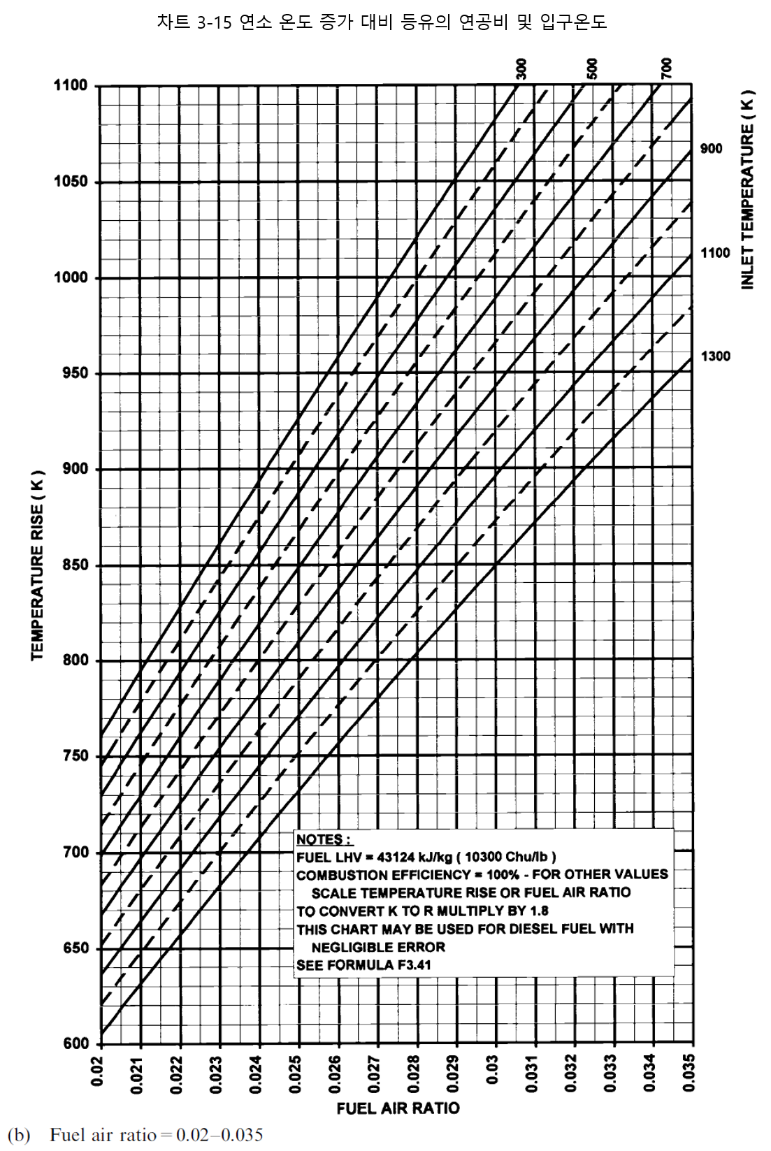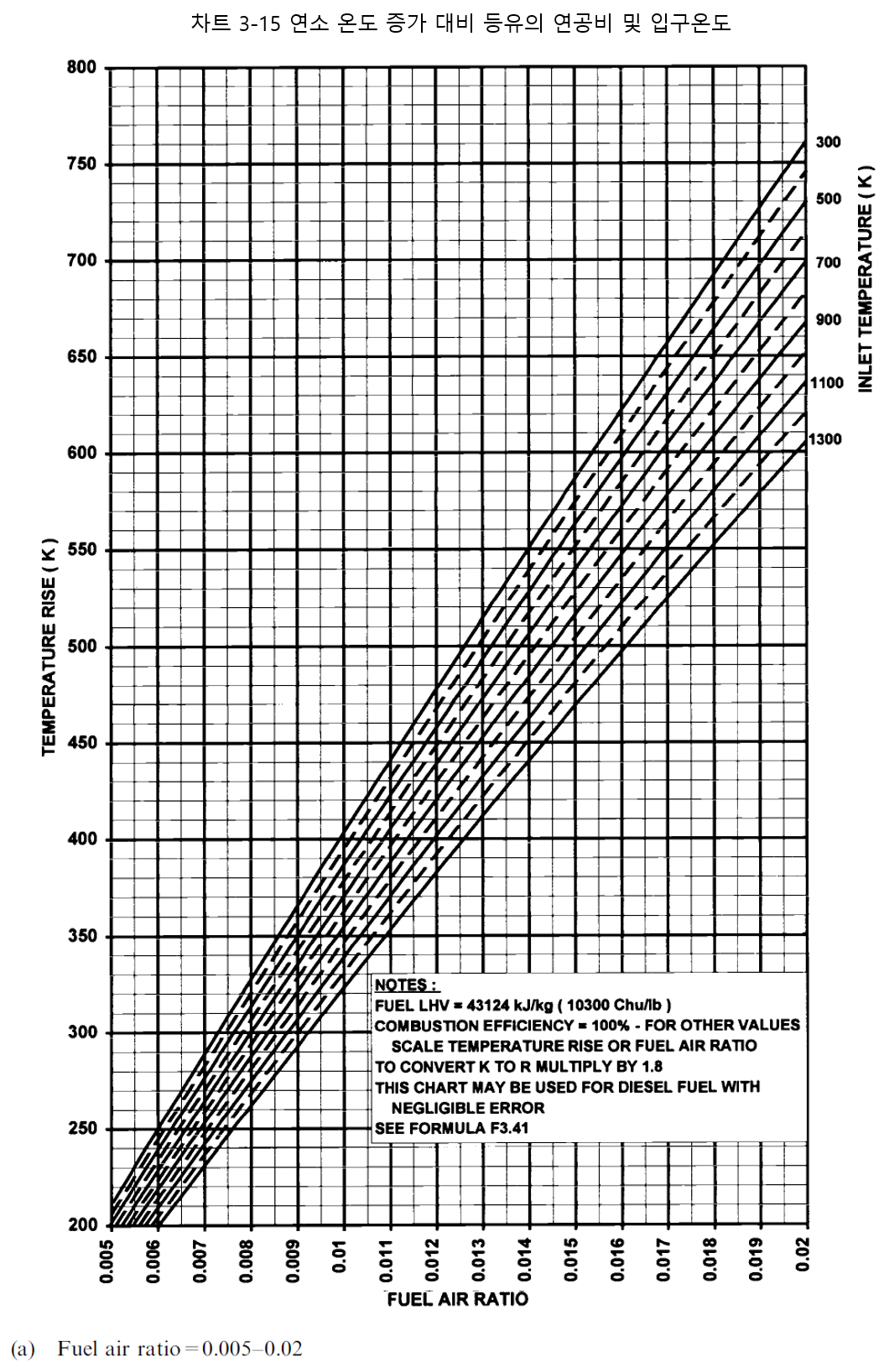 차트 3.15는 등유 연소에 대한 연공비 및 입구 온도 대비 온도 상승을 보여줍니다. 이 차트는 엔탈피 다항식과 일치하며 정확도가 무시될 수 있는 디젤에도 사용할 수 있습니다. 차트 3.15를 통해서 충분히 성능 계산이 가능합니다. 관련 수치들은 프로세스를 단순화하면서 엔탈피 기반 접근법에 근사하게 일치합니다. 해당 차트와 공식은 연료 열량 43124kJ/kg과 연소 효율 100%에 대한 것입니다. 다른 발열량 또는 효율성의 경우 온도 상승 또는 연공비를 적절히 고려해야 합니다. 정확하지는 않지만, 표준 방법론이며 연료 유량이 공기 유량보다 훨씬 적고 연소 효율이 일반적으로 100%에 가깝기 때문에 매우 낮은 오차가 발생합니다.