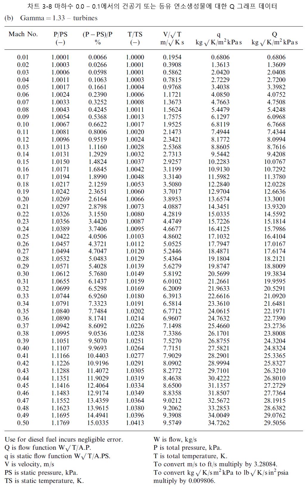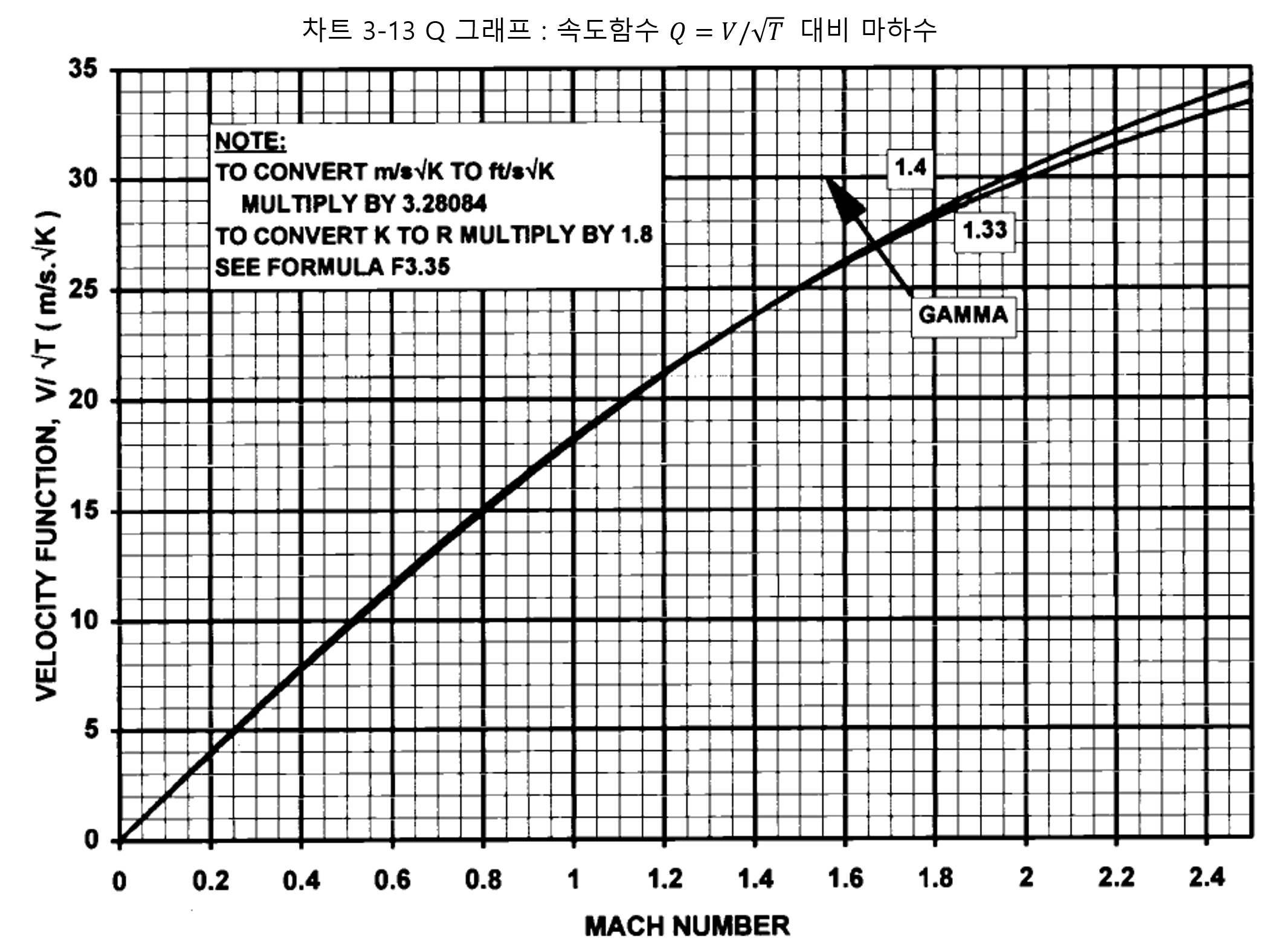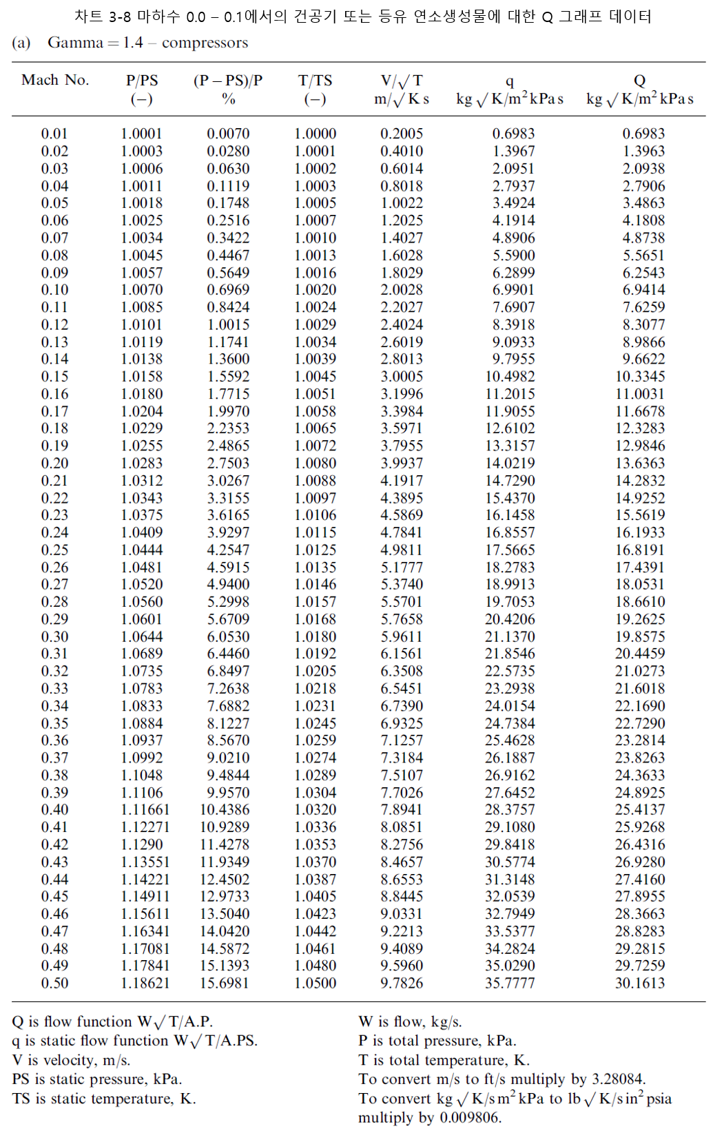그에 대한 엄청난 수치로 인해서 가장 일반적으로 사용되는 마하수 범위 0-1에 대한 Q 곡선 데이터가 차트 3.8에 제공됩니다. 마하수 범위인 0-2.5에 대한 가장 유용한 매개변수 그룹은 아래 차트에도 나와 있습니다. 해당 범위는 수축-확산 추진 노즐에서 가장 높은 확률로 발생할 수 있는 데이터입니다. 표시된 감마 값은 1.4와 1.33으로, 엔진의 냉간단과 열간단의 일반적인 수준입니다. 더 높은 정확도가 요구되는 계산이나 마하수가 2.5를 초과하는 경우에는 관련 공식을 사용해야 하며, 기체 특성에 대한 정확한 값을 사용해야 합니다.