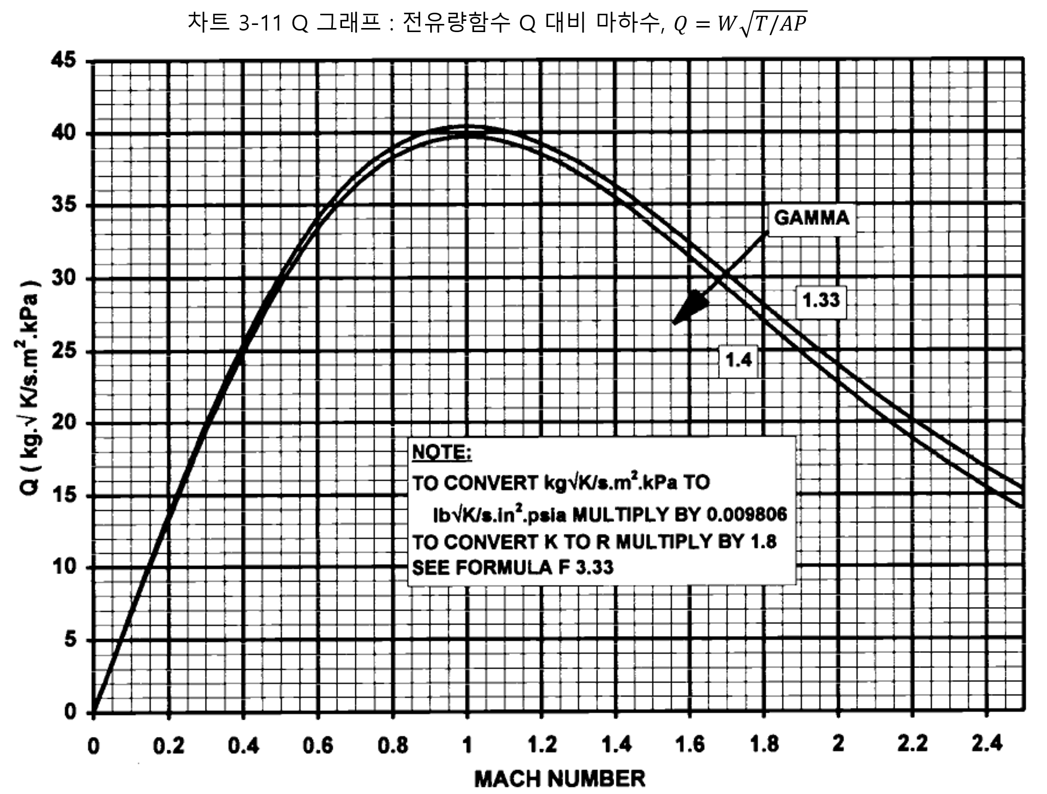 . 흐름 함수, W*sqrt(T)/A.P(Q) 대 마하 수 – 차트 3.11
