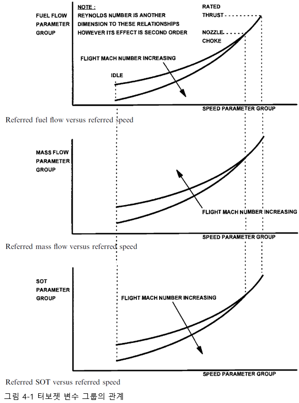 그림 4.1은 터보젯 관련 매개변수에 대한 성능 표현을 보여줍니다. 먼저 정확도 순서대로 말하자면, 고정된 형상의 엔진의 경우 이와 같은 수치 중 하나가 모든 주변 온도 및 압력, 비행 마하수 및 스로틀 설정에서 엔진 성능을 완전히 정의할 수 있습니다. 이와 같은 내용은 다음 사항을 통해 확인할 수 있습니다: