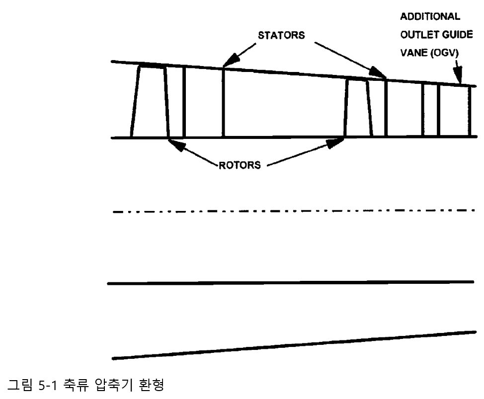 그림 5.1은 축류 압축기의 일반적인 블레이드 구성을 보여줍니다. 하나의 스테이지는 한 줄의 고정자(스테이터, Stator) 베인이 뒤따르는 한 줄의 로터 블레이드로 구성됩니다. 공통 축에 로터가 있는 여러 단이 압축기를 형성합니다. 종종 구조적 하중을 전달하거나 유동이 하류의 덕트로 들어가기 전에 잔류 와류를 제거하기 위해 마지막 스테이터 열의 하류에 추가 OGV(Outlet Guide Vanes) 열이 필요로 하게 됩니다. 또한 가변 흡입 가이드 베인(VIGV, Variable Inlet Guide Vanes)을 사용할 수 있습니다. 이와 같은 구성품들은 오프 디자인 작업을 개선하기 위해 제어 시스템 동작에 의해 각도가 변경될 수 있는 스테이터 베인 열입니다. 스테이터 열 중 일부는 가변 각도일 수도 있으며 가변 스테이터 베인(VSV, Variable Stator Vanes)이라고 합니다. 만족스러운 부품 속도 서지 라인을 제공하려면 5단을 초과하는 각각 추가 압축기 단계당 VIGV 또는 VSV 1단이 1차 규칙으로써 필요합니다. 핸들링 블리드 밸브를 사용할 수 있는 경우, 이와 같은 비율은 감소하게 됩니다.