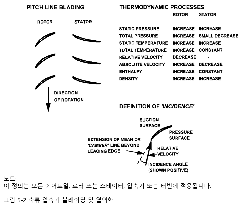 그림 5.2는 피치 라인, 즉 허브와 팁의 평균에서 일반적인 로터 블레이드 및 스테이터 베인 부분을 보여줍니다. 또한 단을 통해 선행 매개변수의 변화를 보여주고 입사각을 정의합니다. 그림 5.3은 설계 속도와 압력비, 그리고 서지 근처와 초크에서 피치 라인 블레이드에 대한 속도 삼각형을 보여줍니다. 로터 블레이드는 축동력 입력을 증가한 정적 온도, 절대 속도 및 전온도의 형태로 엔탈피로 변환됩니다. 그러나 그림 5.3에서 볼 수 있듯이 모든 블레이드 및 베인 열 내에서 상대 속도는 감소하므로 정압력은 증가합니다. 입력 동력은 질유량, 블레이드 속도 및 기체 회전 속도 변화의 곱입니다. 스테이터 베인의 경우, 일이나 열전달이 없고, 마찰과 난류 혼합 손실만 있습니다. 여기서 유동은 단지 확산되고 정압이 더 증가하기 위해 속도가 교환됩니다. 로터와 스테이터를 통과하는 역정압 구배로 인해 단일 단에서 달성할 수 있는 압력비는 유동 박리 및 역전을 피하기 위해 제한됩니다.