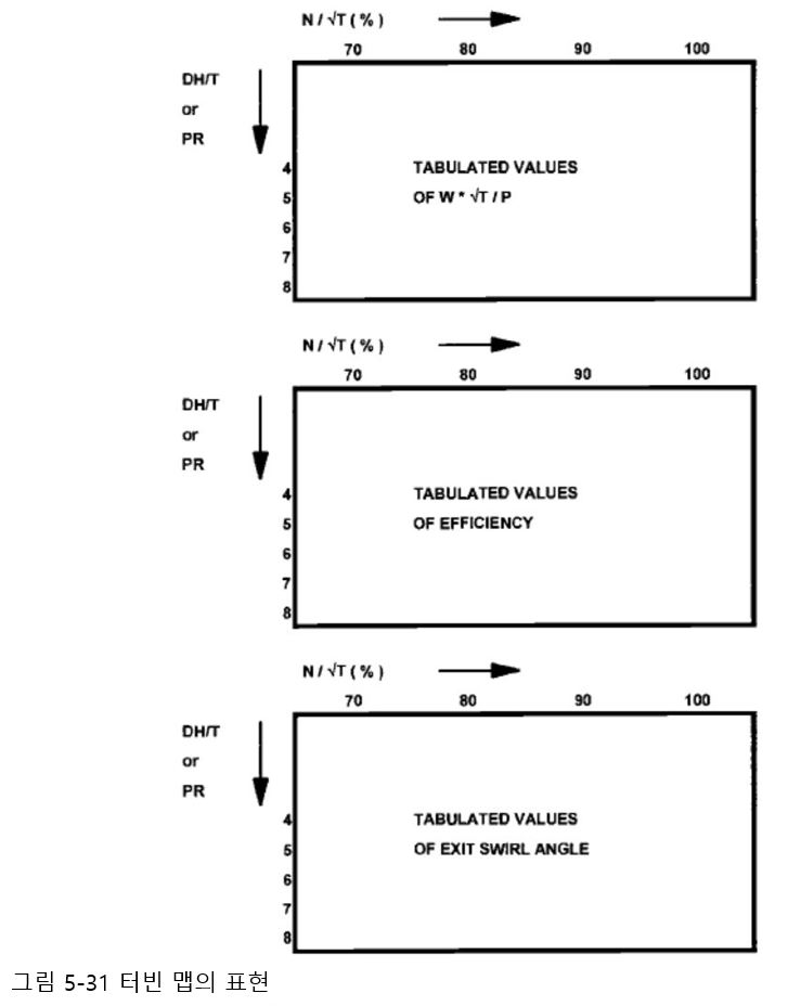 그림 5.31은 터빈 맵이 어떻게 디지털화되고, 엔진 탈 설계 성능 모델에 반영되는 세 개의 테이블로 배열되는지 보여줍니다. 이러한 모델에서 해당 맵의 사용은 다음에 자세하게 설명할 예정입니다. 엔진 시동 모델용 맵은 5.10.7절에 설명된 대로 대체 변수를 활용하여 모델 수렴을 지원합니다.