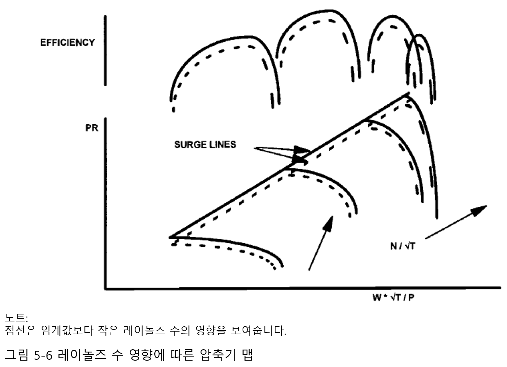 그림 5.6에 표시된 압축기 맵의 경우, 레이놀즈수는 엄격하게 터빈 맵의 4차원이기도 합니다. 용량과 효율은 모두 참조 속도와 CPdT/T에서 약간 감소합니다. 그러나 터빈의 높은 압력과 온도로 인해 레이놀즈수는 거의 임계 값 이하로 떨어져 영향을 미치지 않습니다.