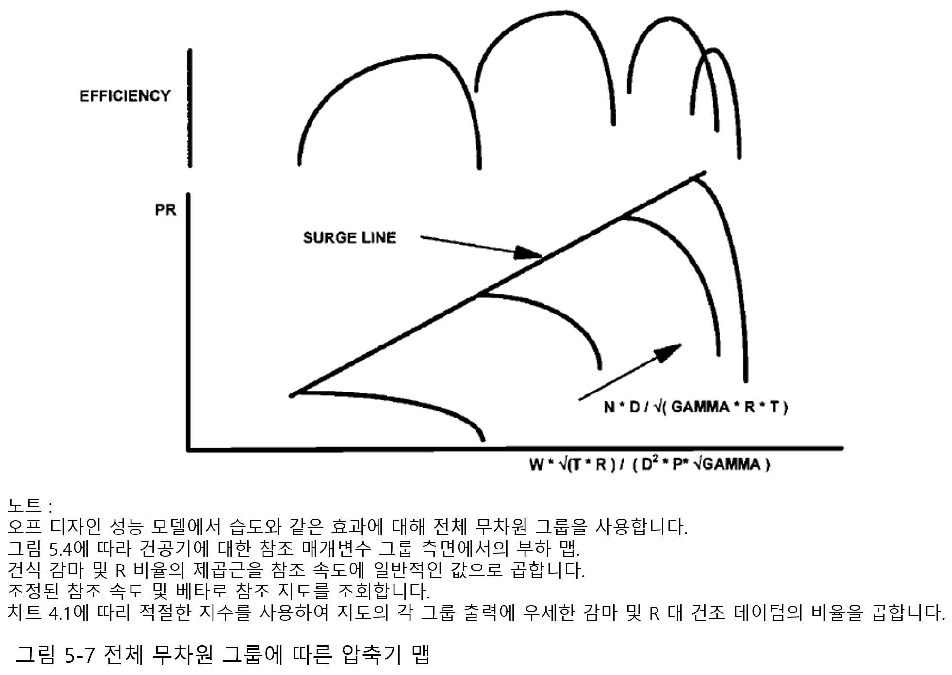 대부분의 엔진 탈 설계 성능 모델은 건공기에 대한 맵을 사용하고 그림 5.7 및 추후 장에서 압축기에 관해 설명된 대로 가스 속성의 모든 변화를 처리합니다.