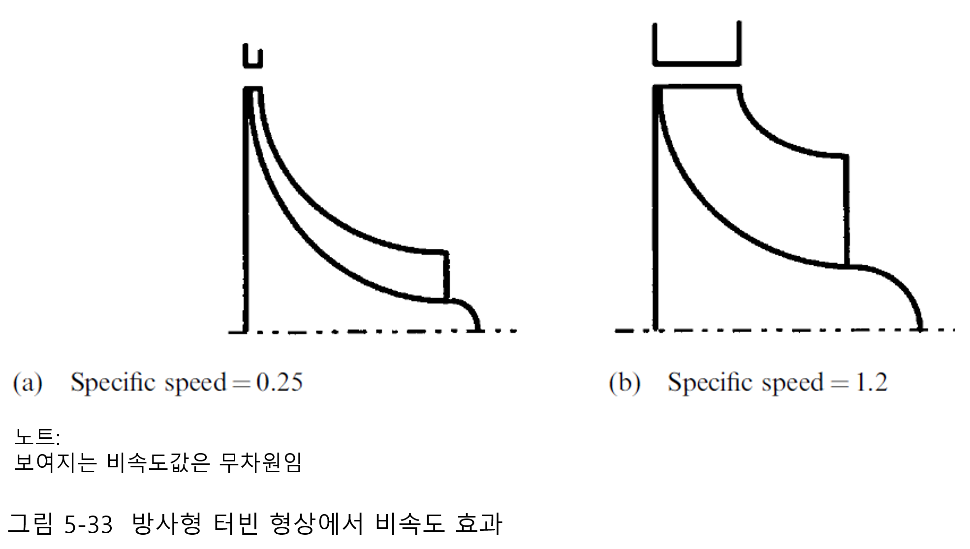 원심 압축기의 경우, 비속도는 효율과 상호 연관될 수 있는 무차원 매개변수입니다. 차트 5.9는 터빈 효율을 위한 최적의 비속도를 보여줍니다. 그림 5.33은 낮고 높은 비속도에서 제시된 지침에 따른 일반적인 형태들을 보여줍니다.
