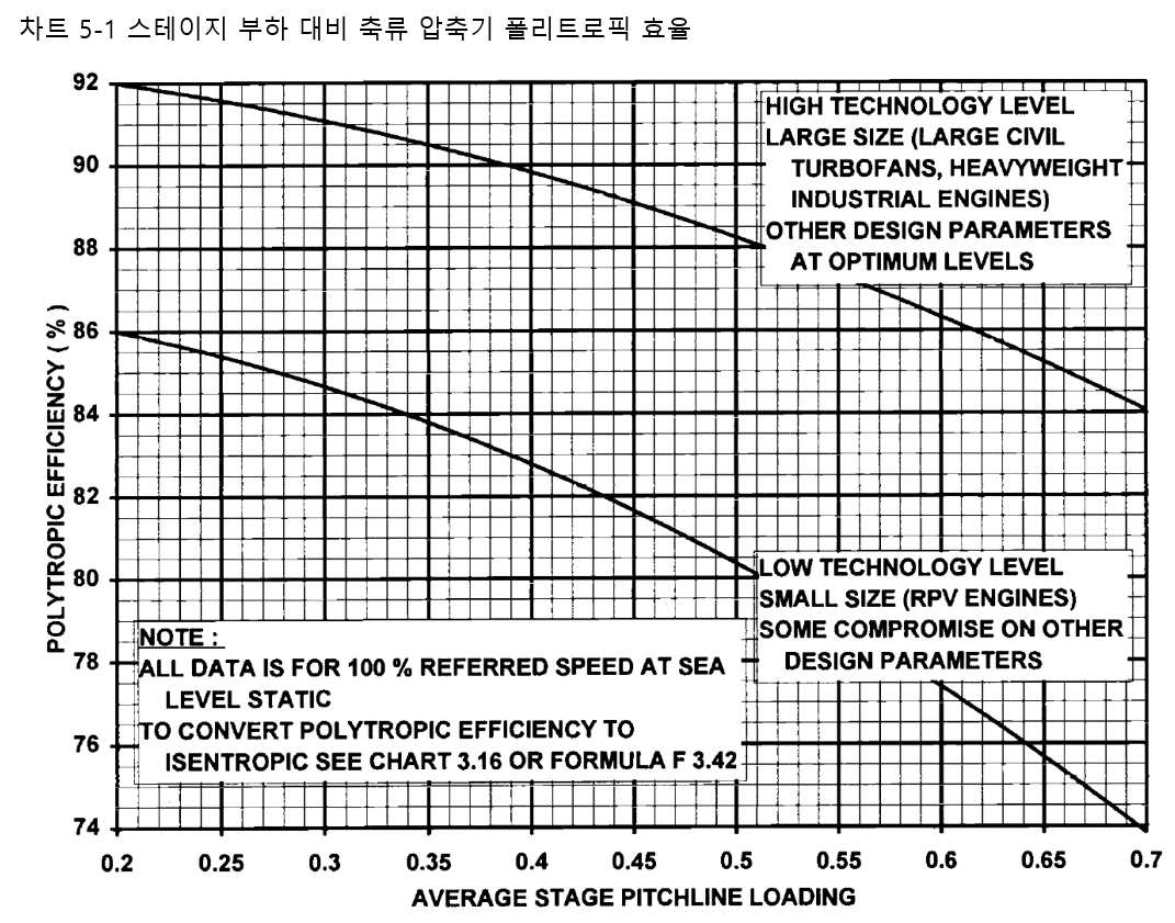 축류 압축기의 폴리트로픽 효율은 상세 설계에 사용할 있는 크기와 기술 수준이 증가함에 따라 향상됩니다. 그에 따라 부하 스테이지 압력비가 감소하고 매우 작은 전면 영역과 같은 기하학적 제약이 완화됩니다. 차트 5.1 일반적인 수준의 폴리트로픽 효율 평균 스테이지 부하를 나타냅니다. 가장 높은 라인은 수십 년의 경험과 최첨단 설계 도구를 갖춘 회사에서 설계한 대형 산업용 헤비급 엔진 또는 민간 터보팬에 적용할 있으며, 가장 낮은 라인은 RPV 엔진에 일반적입니다. 전면 영역을 최소화하는 기하학적 제약으로 인해 초음속 엔진은 최고선보다 1~3포인트 낮습니다.