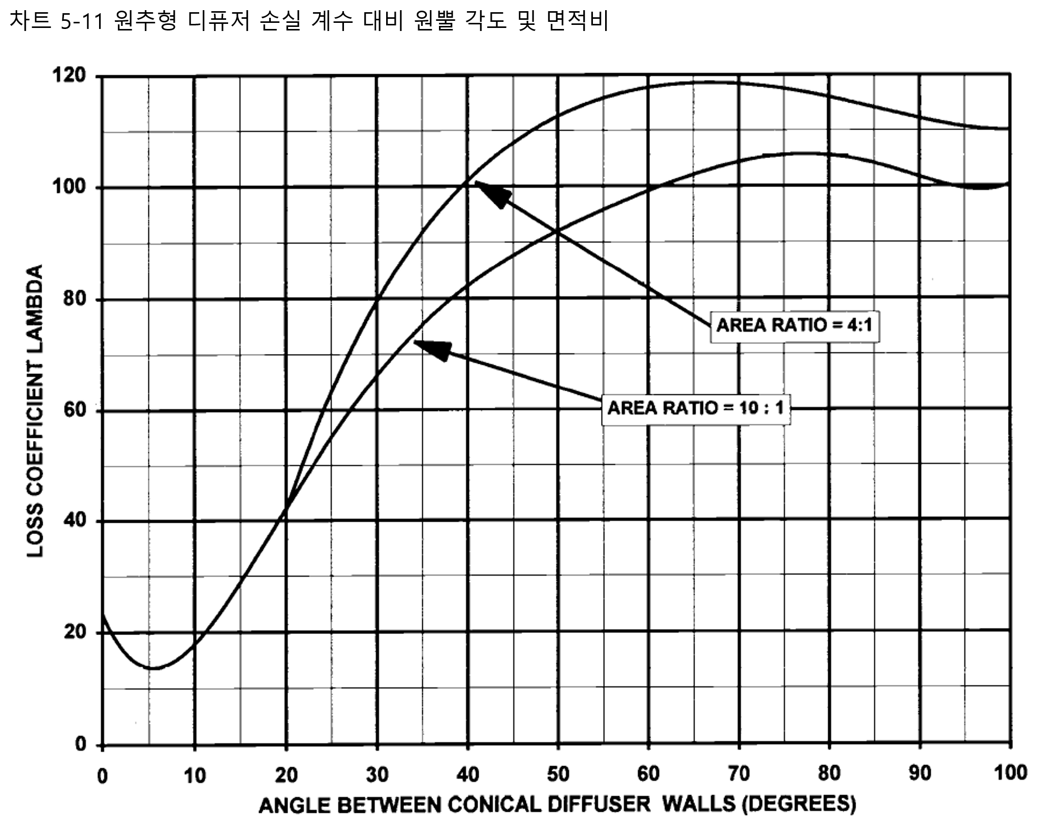 . 차트 5.11에 따라 산업용 엔진 원추형 디퓨저 배기 시스템은 설치 공간 제약 내에서 가능한 한 6도에 가까운 원뿔 포함 각도를 가져야 합니다. 길이와 무게 제약으로 인해 항공 엔진의 원추형 디퓨저는 15~25도의 원뿔 포함 각도를 사용합니다.