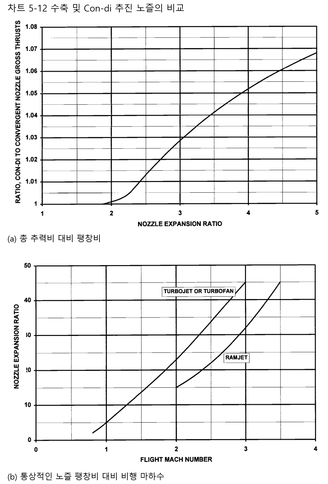 일반적인 엔진의 경우, 차트 5.12는 수렴형 노즐 대비 팽창비에 대한 con-di 노즐의 총 추력 비율을 보여줍니다. con-di 노즐에 대해 표시된 총 추력은 노즐이 완전히 작동하고 있다고 가정합니다. 이는 5.14절에서 논의된 탈 설계 이유와 흡기 및 메인 엔진과 직경을 동일하게 유지하기 위해 con-di 노즐이 최대로 작동하도록 설계되어 유동 가속이 덜 발생한다는 점에서 낙관적입니다. 차트 5.12에서 4:1의 노즐 팽창비에서 수렴형 노즐이 5% 더 나빠지는 것을 알 수 있습니다. 이것은 모멘텀 항력이 변하지 않기 때문에 순 추력에 대해 훨씬 더 큰 차이가 될 것입니다. 이것은 콘디 노즐의 추가 무게와 비용을 상쇄하는 값에 가깝습니다. 이러한 항목은 대부분의 초음속 항공 엔진이 애프터버너를 사용하므로 추진 노즐이 가변 목 영역이어야 한다는 점에서 중요합니다. 차트 5.12는 또한 터보팬, 터보제트 및 램제트의 비행 마하수에 대한 일반적인 추진 노즐 팽창비를 보여줍니다. 따라서 con-di 노즐은 일반적으로 마하 1보다 훨씬 높은 속도로 작동하는 항공기의 엔진 응용 분야에 선택됩니다. 램제트의 경우, 가장 낮은 비행 마하수는 2 정도이므로 con-di 노즐이 보편적으로 사용됩니다.