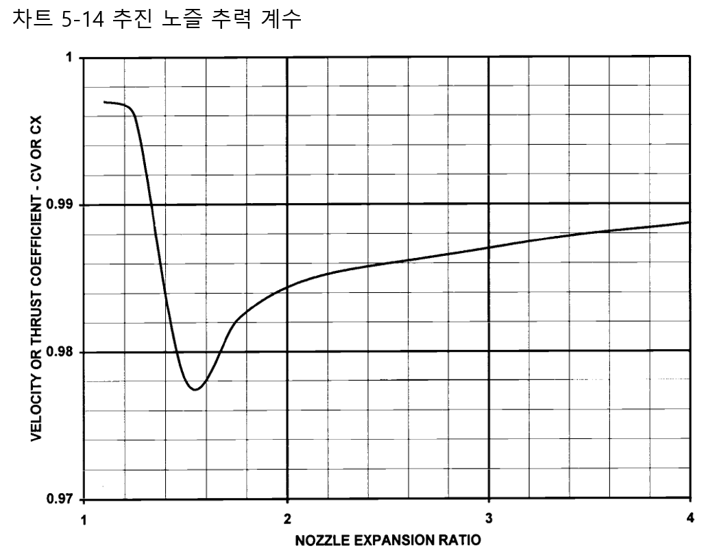 관련 공식에 표시된 대로 추진 노즐 출구 속도와 초킹된 경우, 정압은 Q 곡선을 사용하여 계산됩니다. 약간의 마찰과 유동 불균일성이 있기 때문에 실제 속도는 계산된 것보다 약간 낮습니다. 관련 공식으로 정의된 추력 계수(CX) 또는 속도 계수(CV)는 이를 설명하는 데 사용됩니다. CX는 업계에서 가장 일반적으로 사용되는 것으로 여기에서도 사용됩니다. 차트 5.14는 수렴형 추진 노즐의 노즐 팽창비에 따라 CX가 어떻게 달라지는지를 보여줍니다. 이 그래프는 노즐 원뿔 각도 및 직경 비와 상당히 독립적입니다. 2:1~4:1 범위의 설계점 팽창비의 경우, CX는 0.98보다 큽니다. con-di 노즐의 경우, 벽면 냉각으로 인한 추가적인 유동 불균일성 및 유동 각도로 인해 추가 총 추력 손실이 있습니다. 후자의 이유로 노즐 발산부의 사이의 각은 축에 수직인 속도 성분을 최소화하기 위해 30도 미만이어야 합니다. 이에 따라 노즐이 길면서 무겁기도 하며, 가변 형상을 통해 벽의 원뿔 각도를 조정할 수 있는지 여부에 따라 높은 비행 마하수에서 CX는 약 0.95–0.97이 됩니다.
