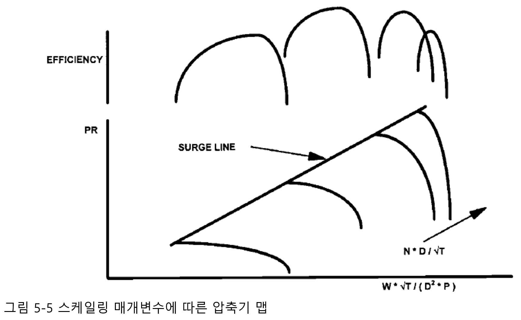 5.1.2절에서는 압축기를 선형적으로 스케일링하는 설계점 성능에 미치는 영향에 관해 설명합니다. 그림 5.4 따라 참조된 매개변수로 표시된 전체 맵은 유사한 방식으로 축척될 있습니다. 그림 5.5 4장에 설명된 스케일링 매개변수 측면에서 도시된 압축기 맵을 보여줍니다. 우선 맵은 압축기 설계의 모든 선형 스케일에 대해 고유합니다.