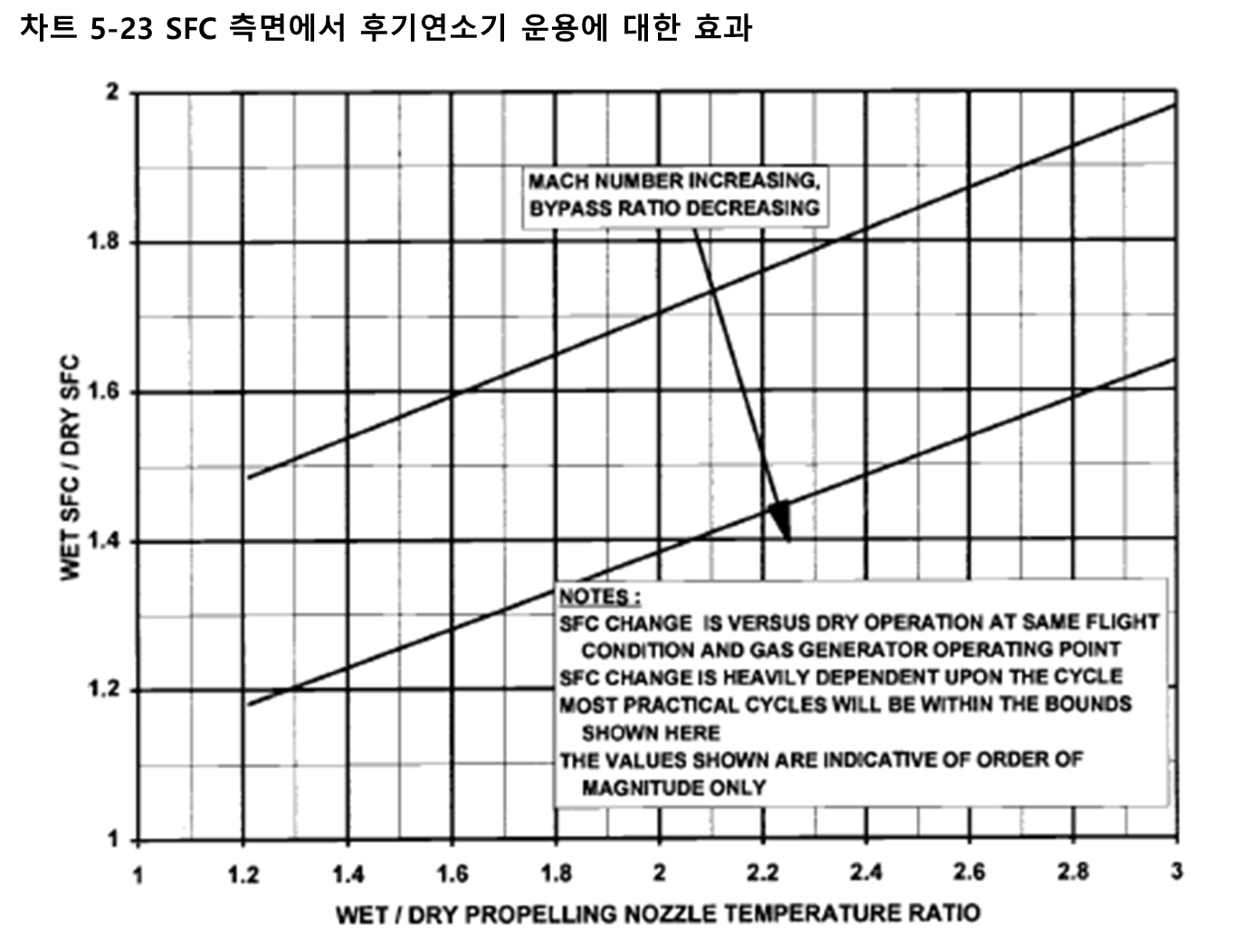 차트 5.23은 Wet 대 Dry SFC비 대 Wet 대 Dry 추진 노즐 온도 비를 보여줍니다. 다시 한번 Wet과 Dry 모두의 경우 가스 발생기 운용점은 변경되지 않습니다. 관련 공식은 1차적으로 증가된 연료 유량을 추정하는 방법을 보여주고, 또 다른 관련공식은 SFC 비를 보여줍니다. 다시 한번 Dry 엔진 성능이 사용 가능해지면 주어진 애프터버너 온도에 대한 SFC 변화를 평가할 수 있습니다. 이러한 공식은 SFC 비가 압축기 공급 온도 및 SOT와 같은 가스 발생기 사이클 매개변수에 크게 의존한다는 것을 보여줍니다. 차트 5.23은 SFC가 애프터버너 작동 시 항상 더 나쁘다는 것을 보여줍니다. 이는 저압에서 연료를 추가하고, 압력 손실이 발생하고, 연소 효율이 약 90%로 추력 이득보다 크기 때문입니다. 터보젯의 경우 마하 2, 온도 비 1.2에서는 SFC가 약 20% 정도 저하되지만, 바이패스 비율 1.5 터보팬의 경우 마하 2, 온도 비율 3에서는 최대 60%까지 저하됩니다.