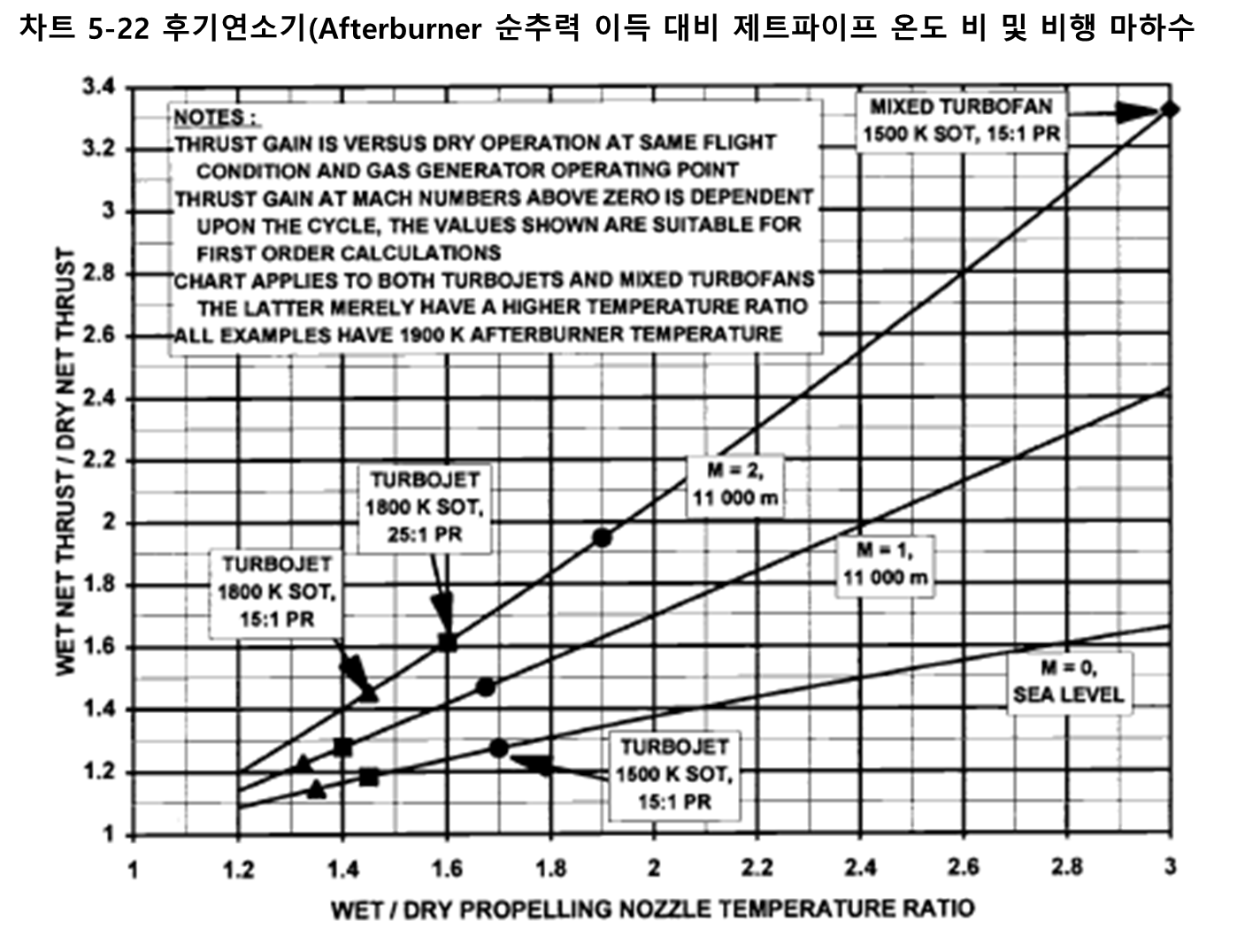 위에서 언급했듯이 애프터버너의 목적은 추력을 증가시키는 것입니다. 차트 5.22는 일정한 비행 마하 수의 라인에 대한 Wet 대 Dry 순 추력의 비율과 Wet 대 Dry 추진 노즐 온도비를 보여줍니다. 이 수치는 터보젯과 터보팬 모두에서 사용 가능한 추력 증가에 대한 1차 추정치를 만드는 데 사용될 수 있습니다. 각 지점은 변경되지 않은 가스 발생기 운용점에 대한 것입니다. 따라서 Dry 엔진 추진 노즐 온도를 알게 되면 주어진 애프터버너 온도에 대한 추력 증가를 결정할 수 있습니다.
