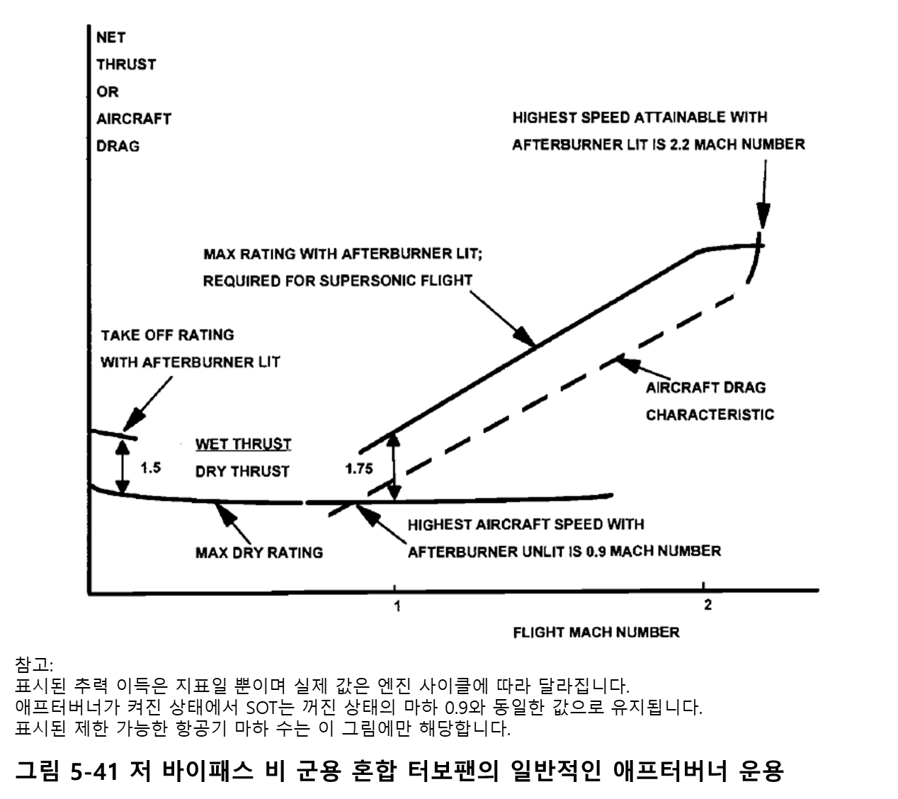 그림 5.41은 일반적인 군용 전투기 작전에 대한 엔진 순 추력과 항공기 항력 대 비행 마하 수를 보여줍니다. 애프터버너는 이륙에 작동하지만, 좋은 SFC를 유지하기 위해 전투를 제외하고는 아음속 비행에 사용되거나 실제로 필요하지 않습니다. 그러나 0.9의 비행 마하 수는 항공기 항력이 엔진 최대 Dry 추력을 초과하기 때문에 달성 가능한 가장 높은 Dry 마하 수입니다. 따라서 해당 마하 수에서 애프터버너가 점화되고 추가 추력으로 인해 항공기가 음속 장벽을 빠르게 통과할 수 있습니다. 최대 비행 마하 수는 이제 2.2이며, 여기서 항공기 항력이 다시 엔진 추력을 초과합니다.