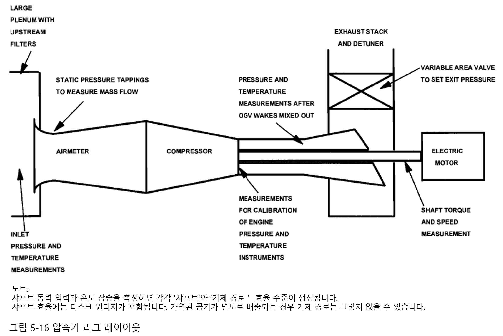 일반적인 리그 구성은 그림 5.16에 나와 있습니다. 압축기는 지정된 속도로 제어되는 전기 모터에 의해 구동됩니다. 유량, 압력비 및 효율을 계산할 수 있도록 측정이 이루어집니다. 그런 다음 압축기 속도가 유지된 상태에서 출구 밸브가 닫히면 압력비가 증가하고 유량이 감소합니다. 이 프로세스는 서지 라인을 만날 때까지 반복됩니다. 그런 다음 여러 스피드 라인에 대해 유사한 절차를 따릅니다. 속도를 변경하는 각 스로틀 설정에 대해 엔진 내의 압축기 작동과 유사한 고유한 작업 라인이 생성됩니다.