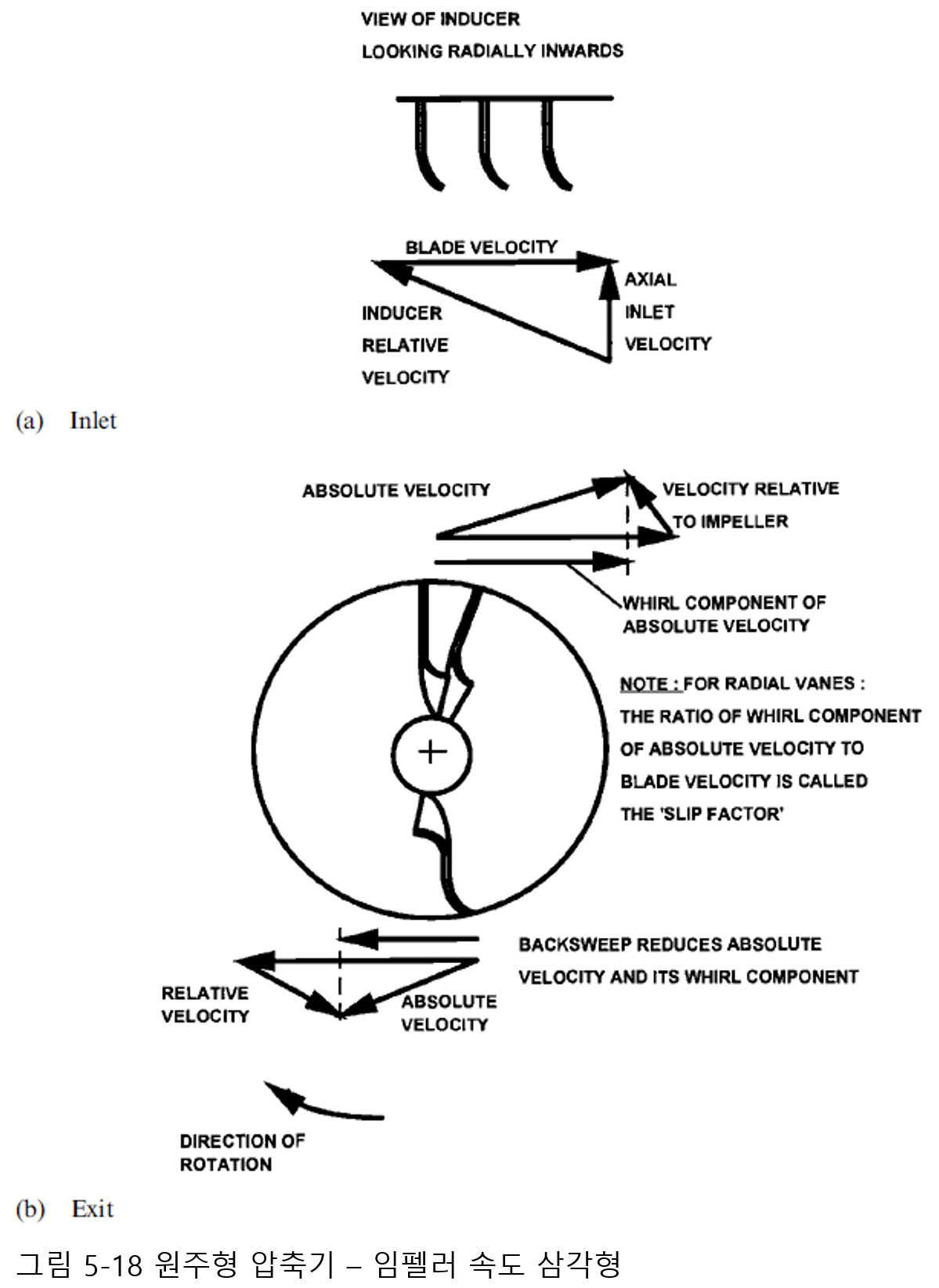 그림 5.18은 레이디얼 베인과 백 스윕 베인 모두에 대한 속도 삼각형을 보여줍니다. 필요한 작업 입력은 축류 압축기에 따라 관련 공식들로 정의됩니다. 이상적으로 방사형 베인의 경우 익스듀서에서 상대 속도는 방사형이고 절대 속도의 소용돌이 성분은 림 속도와 동일합니다. 그러나 그림 5.18과 같이 실제로는 약간의 미끄러짐이 발생합니다. 슬립은 블레이드 속도에 대한 절대 속도의 소용돌이 구성 요소의 비율로 정의됩니다.