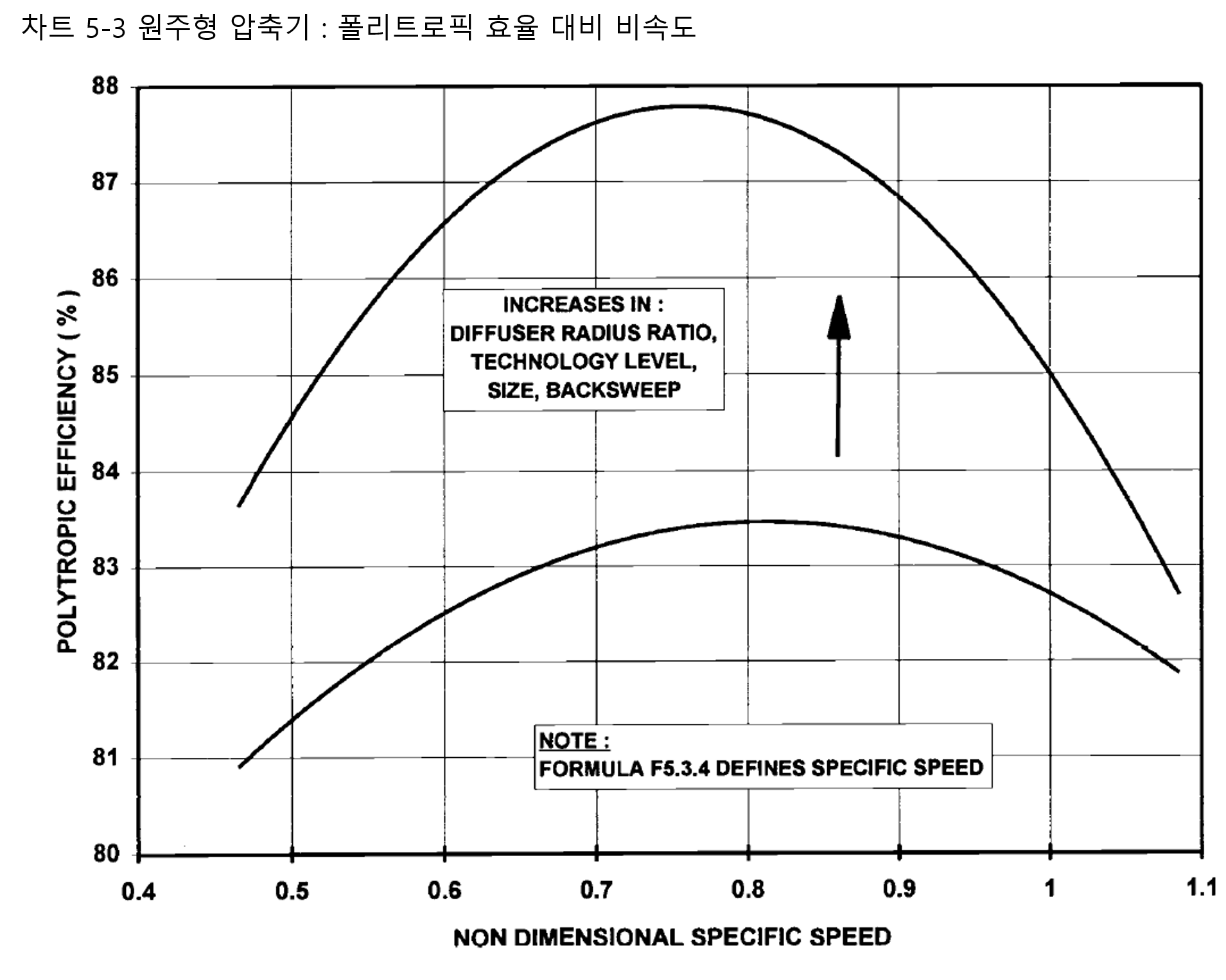 차트 5.3은 폴리트로픽 효율 대 비속도를 보여줍니다. 하단 라인은 낮은 기술 수준, 제로 백 스윕, 낮은 디퓨저 반경 비율 및 작은 크기를 위했지만 상단은 컨버스를 위한 것입니다. 이 차트는 초기 설계점 계산을 위한 원심 압축기 효율을 추정하는 데 사용할 수 있습니다. 효율성을 위한 최적의 특정 속도는 약 0.75입니다. 따라서 주어진 설계에 필요한 질유량과 압력비가 설정되면 입구 체적 유량과 엔탈피 변화가 계산되고 이 최적의 특정 속도를 달성하는 데 필요한 회전 속도가 도출될 수 있습니다. 설계가 진행됨에 따라 다른 모든 공기역학적 및 기계적 설계 한계를 수용할 수 없거나 터빈 설계자의 요구에 맞게 유지할 수 없기 때문에 회전 속도를 변경해야 한다는 것을 알 수 있습니다. 특정 속도는 결과적으로 효율성 손실과 함께 최적 속도에서 멀어지게 됩니다.