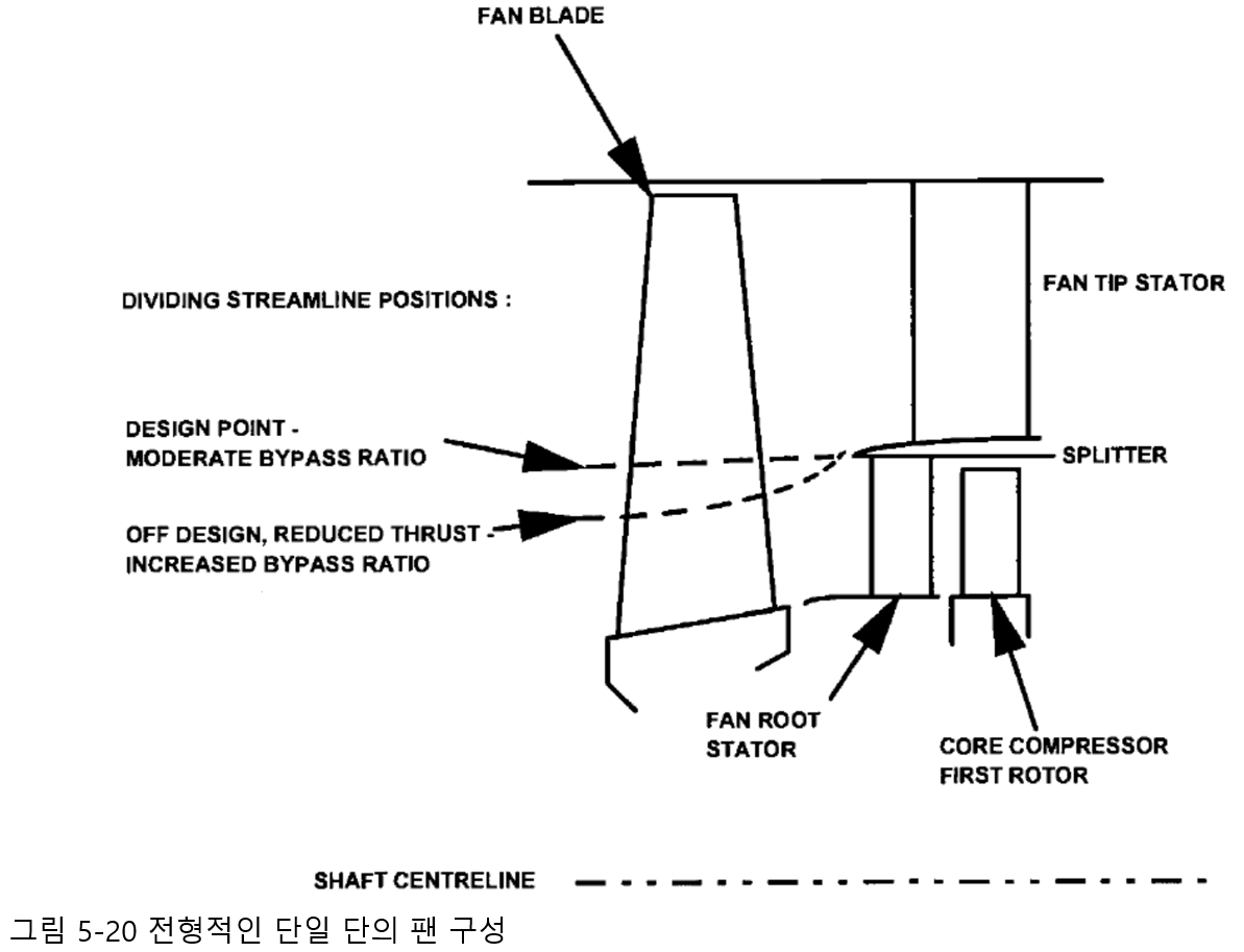 팬은 원심 스테이지에 필요한 직경 및 하류 덕트가 금지되어 있으므로 항상 축류에 적용됩니다. 단일 단의 팬의 일반적인 배열은 그림 5.20에 나와 있습니다. 로터 블레이드 다음에는 팬 팁과 팬 루트 스테이터가 옵니다. 이들은 일반적으로 스플리터의 다운스트림이며, 공기역학적 설계는 종종 구조적 임무 및 오일 파이프와 같은 서비스가 가스 경로를 통과할 수 있도록 하는 요구 사항에 의해 손상됩니다. 팬 팁과 팬 루트라는 용어는 바이패스 흐름과 코어 흐름을 각각 설명하는 데 일반적으로 사용됩니다.