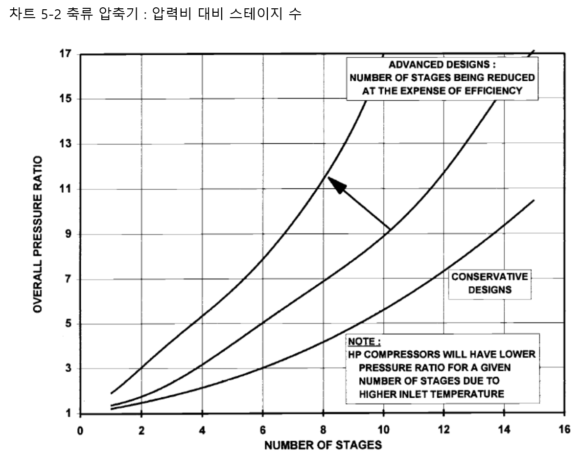 차트 5.4는 단일 스테이지 팬의 일반적인 폴리트로픽 효율 수준 대 피치 라인 부하를 보여줍니다. 아래 제시된 우수한 설계 지침을 충족하는 데 있어 크기, 기술 수준 및 타협 정도에 따른 변화를 나타내는 밴드가 제시되어 있습니다. 허용할 수 있는 블레이드 진동 특성을 제공하기 위해 클래퍼(Clapper) 또는 스너버(Snubber)를 사용하는 경우 차트 5.4의 효율 수준을 약 1.5% 포인트 감소시켜야 합니다. 첫 번째 통과 예측의 경우, 차트 5.4는 관련 공식에서 각각 계산된 하중과 함께 팬 팁 및 팬 루트의 피치 라인에 별도로 적용되어야 합니다. 루트 압력비는 초기에 바이패스비가 낮은 RPV 엔진의 경우의 팁에서의 압력비와 같고 바이패스비가 가장 높은 민간용 엔진의 경우 약 80%로 가정해야 합니다.