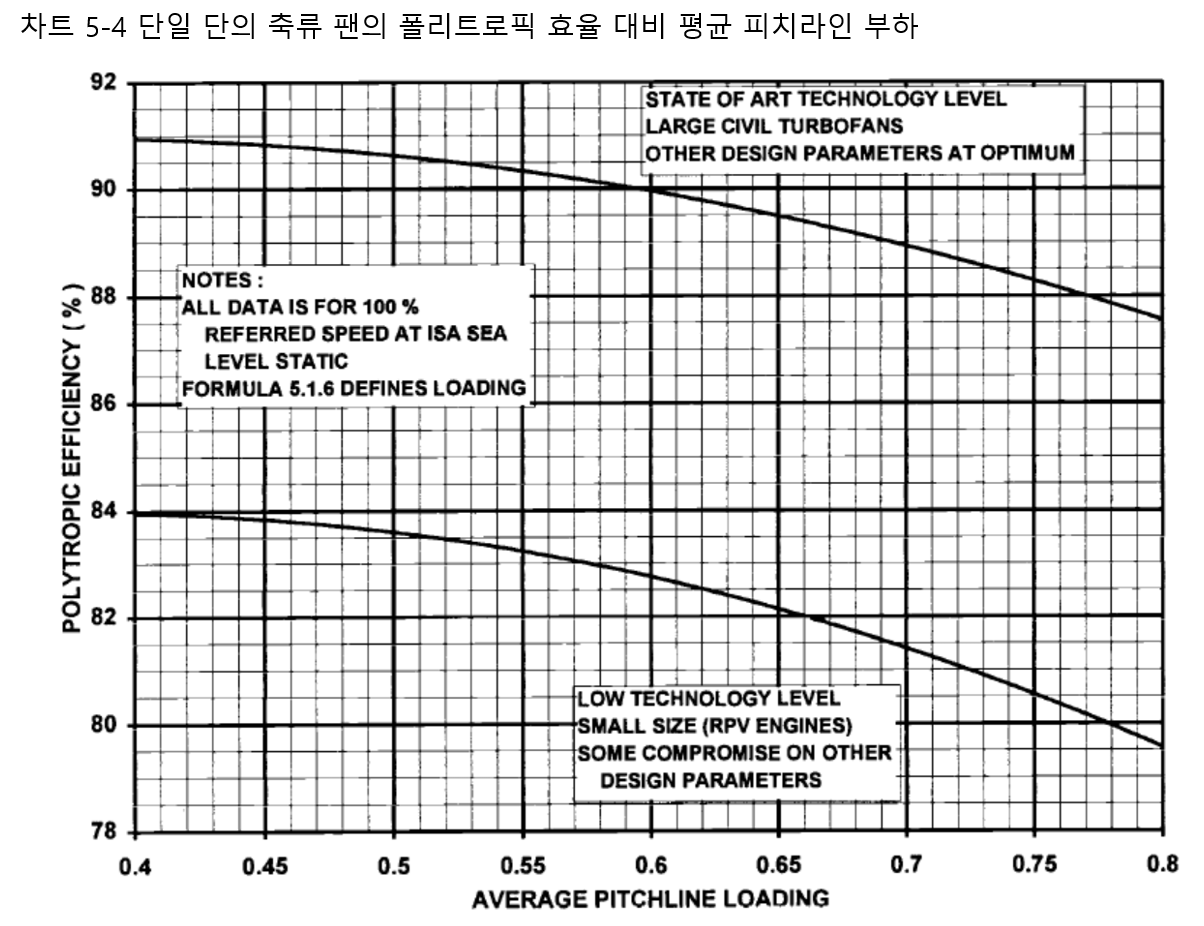 차트 5.4는 단일 스테이지 팬의 일반적인 폴리트로픽 효율 수준 대 피치 라인 부하를 보여줍니다. 아래 제시된 우수한 설계 지침을 충족하는 데 있어 크기, 기술 수준 및 타협 정도에 따른 변화를 나타내는 밴드가 제시되어 있습니다. 허용할 수 있는 블레이드 진동 특성을 제공하기 위해 클래퍼(Clapper) 또는 스너버(Snubber)를 사용하는 경우 차트 5.4의 효율 수준을 약 1.5% 포인트 감소시켜야 합니다. 첫 번째 통과 예측의 경우, 차트 5.4는 관련 공식에서 각각 계산된 하중과 함께 팬 팁 및 팬 루트의 피치 라인에 별도로 적용되어야 합니다. 루트 압력비는 초기에 바이패스비가 낮은 RPV 엔진의 경우의 팁에서의 압력비와 같고 바이패스비가 가장 높은 민간용 엔진의 경우 약 80%로 가정해야 합니다.