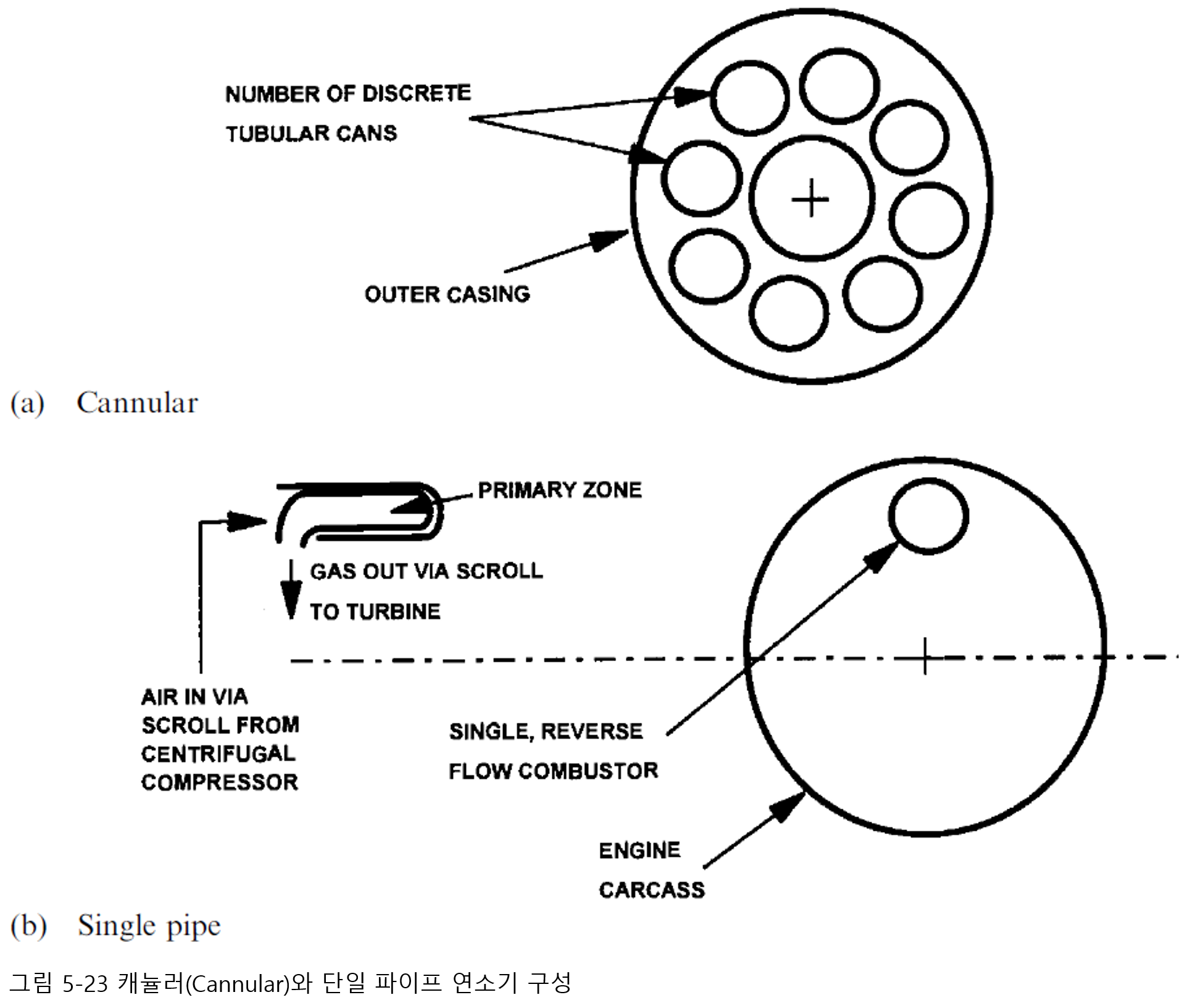 초기 항공기 엔진은 환형 내에 여러 개의 캔을 사용했습니다. 그림 5.23은 이러한 캐뉼러(Cannular) 연소 시스템의 배열을 보여줍니다. 그러나 더 큰 직경과 무게로 인해 이 구성은 이제 환형 시스템으로 대체되었습니다. 또한, 하나 또는 두 개의 캔에서 점화 후 'light around'에 필요한 포트 사이의 상호 연결기는 추가 중량 페널티가 추가됐으며, 기계적 무결성 문제도 있었습니다. 산업용 엔진의 경우, 정면 면적과 무게는 그렇게 중요한 문제가 아니며 일부는 여전히 이 배열을 사용합니다. 이를 통해 장비를 독립적으로 테스트할 수 있어 리그 테스트 시설의 크기와 비용을 줄일 수 있고, 유지 관리 중에 독립적으로 교체할 수도 있습니다. 최소 비용을 위한 소형 산업용 엔진의 경우 그림 5.23에서도 볼 수 있듯이 단일 파이프 연소기가 사용될 수 있습니다. 이는 특히 원심 압축기의 스크롤 출구에 적합합니다.