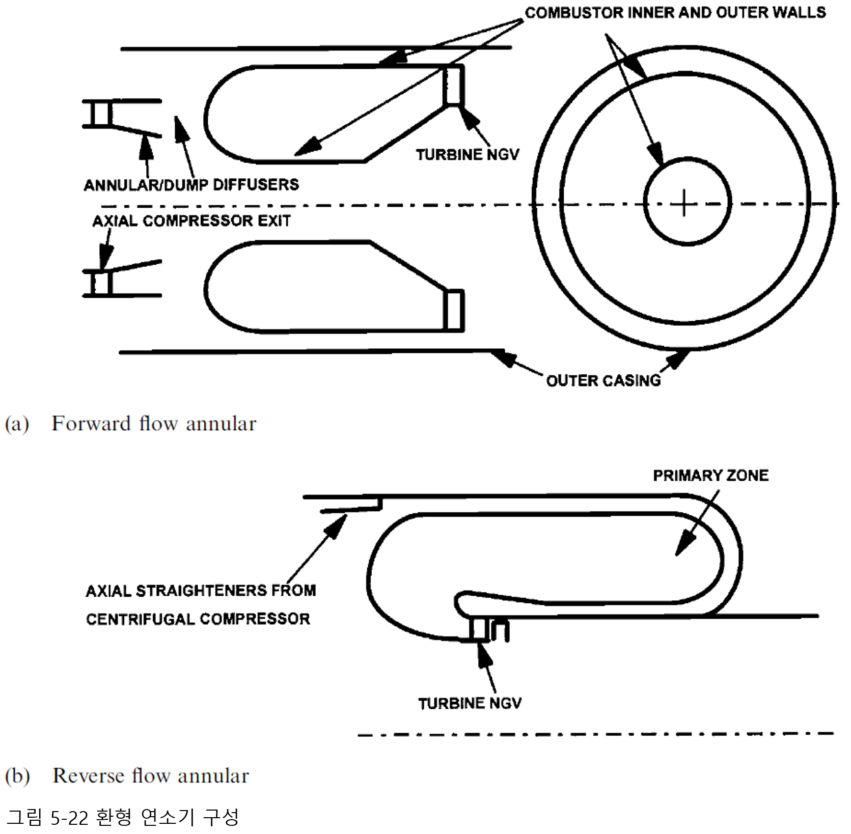 그림 5.22 및 5.24는 다음으로 구성된 환형 연소 시스템의 주요 특징을 보여줍니다.