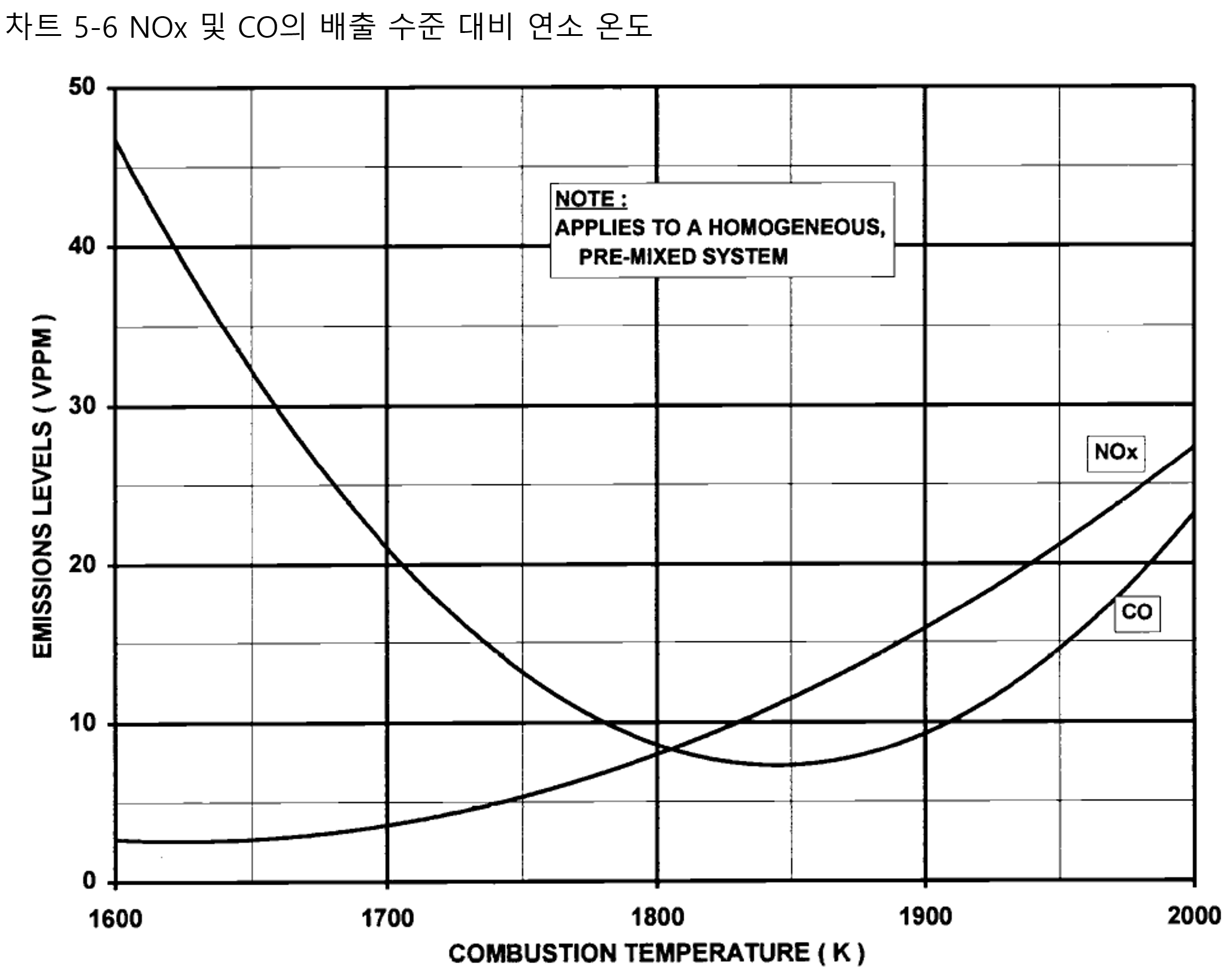 거의 모든 산업용 엔진 설계 솔루션은 연소기 외부에서 연료와 공기를 미리 혼합한 다음 연소기 내부에서 균일한 혼합물을 연소시킵니다. 이것은 연소기 내부의 고온 또는 저온 영역이 각각 많은 양의 NOx 또는 CO를 생성하기 때문에 필수적입니다. 이 같은 과정은 온도와 압력에서 자동 점화 지연 시간이 더 짧기 때문에 천연가스보다 디젤 연료의 경우 훨씬 더 어렵습니다. 차트 5.6은 균질 혼합물의 연소로 인한 온도 대 NOx 및 CO에 대한 결과를 보여줍니다. 기본 부하에서 NOx와 CO의 배출을 동시에 낮추기 위해 1차 구역은 기존 연소기 온도인 약 2300K보다 훨씬 낮은 약 1850K에서 약하게 연소되어야 합니다. 그렇게 되더라도 약 1650K에서 약한 소멸이 발생하여 무시될만한 운용 범위를 나타내기 때문에 엔진이 다시 스로틀 되므로 근본적인 문제가 발생합니다. 이것은 가변 형상, 직렬 및 병렬 연료 단계 시스템과 같은 실용적인 설계 솔루션이 설명된 5.8절에서 더 논의됩니다. 후자의 두 시스템에는 출력 수준에 따라 전환되는 추가 연료 분사 지점이 포함됩니다. 설계점과 탈 설계 모두에서 전체 엔진 성능에 미치는 유일한 영향은 연소기 입구 디퓨저 또는/및 벽 압력 손실이 약간 증가하지만 상당한 제어 복잡성을 추가합니다.