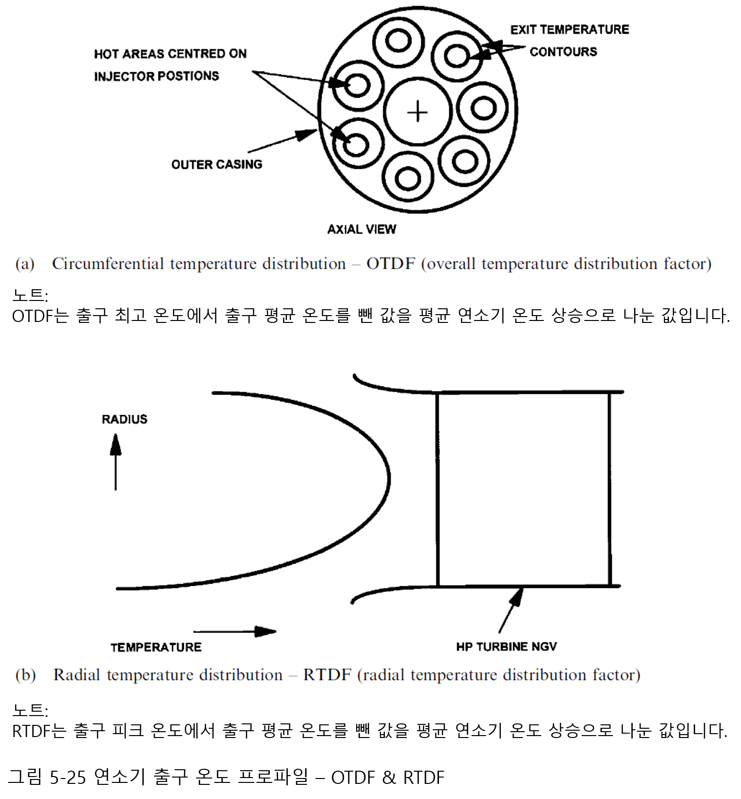 그림 5.25는 환형 연소기의 출구 평면에서 원주 방향 및 방사형 온도 분포를 보여줍니다. 주어진 연소기 설계에 대해 이러한 분포는 두 항으로 정량화됩니다.