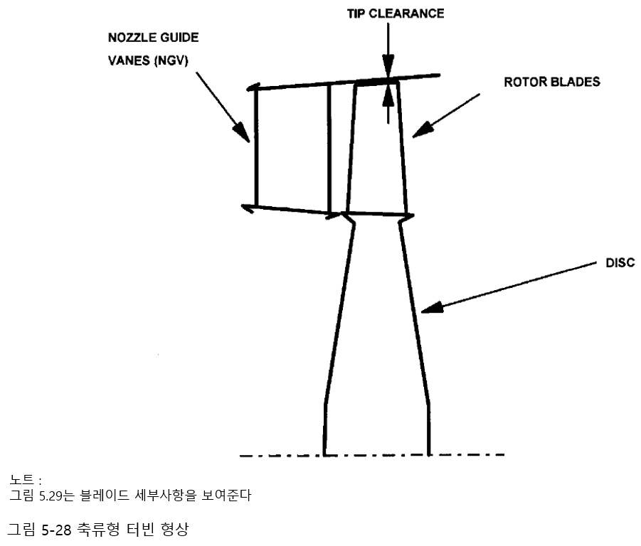 그림 5.28은 1단 축류 터빈의 구성을 나타냅니다. 스테이지는 한 줄의 노즐 가이드 베인(NGV)과 디스크에 장착된 한 줄의 로터 블레이드로 구성됩니다. 슈라우드 블레이드는 간극 손실을 줄이고 종종 연동되어 기계적 댐핑을 제공합니다. 그러나 슈라우드는 스트레스 수준을 높입니다. 다단계 터빈의 경우, 블레이딩은 드럼을 형성하는 원추형 구동기를 통해 연결된 디스크와 함께 환형으로 순차적으로 배열됩니다.