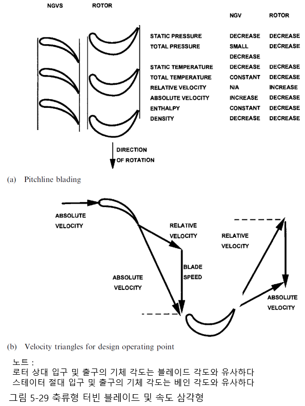 그림 5.29는 입구 및 출구 속도 삼각형과 함께 피치 라인 NGV 및 블레이드 에어포일을 보여주며 스테이지를 통한 주요 열역학 매개변수의 변화도 주석으로 표시하고 있습니다. 고온 및 고압가스는 일반적으로 0.2 마하수 미만에서 축 방향으로 첫 번째 단계 NGV에 들어간 다음, 회전에 따라 가속되면서 유동 면적을 줄입니다. 평균 NGV 출구 마하수는 0.75에서 초음속 사이일 수 있습니다. 일이나 열전달이 없으며 마찰과 난류 손실로 인한 총 압력 손실이 적습니다. 냉각 공기를 추가하는 경우를 제외하고 전체 온도는 변하지 않고 정압과 온도는 가속으로 인해 감소합니다.